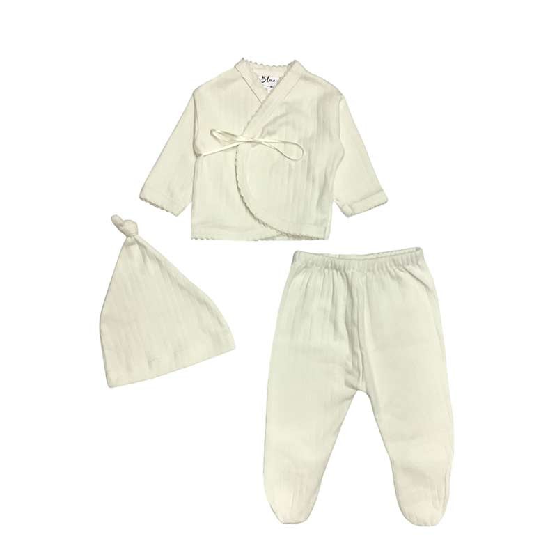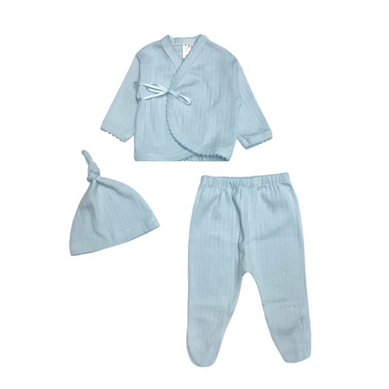 Conjunto acanalado batita c/cinta + medio osito + gorro. En bolsita de tul.