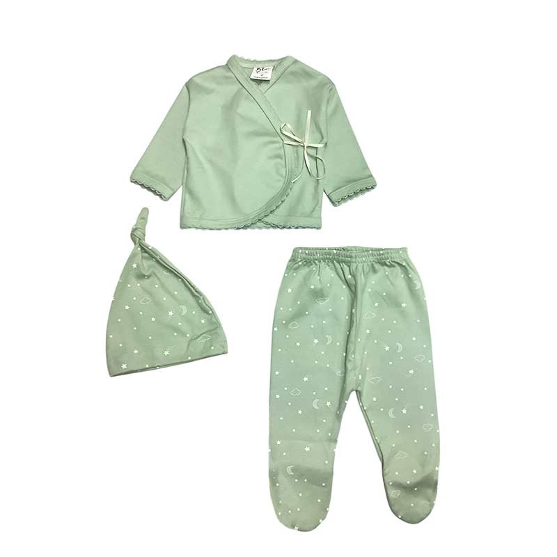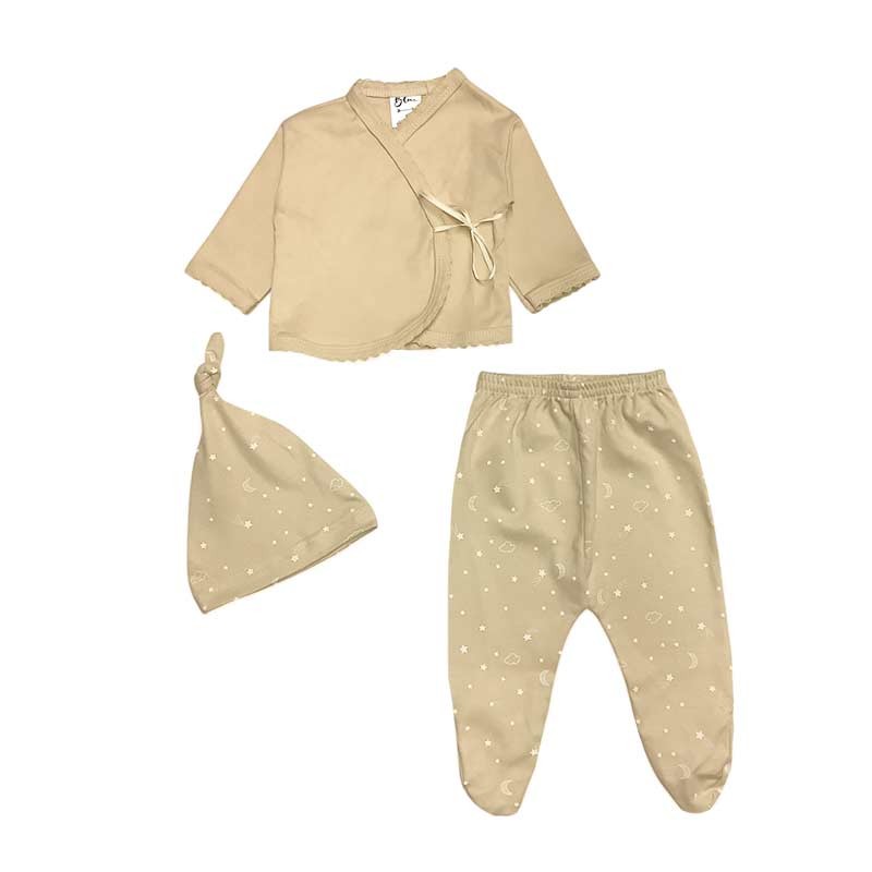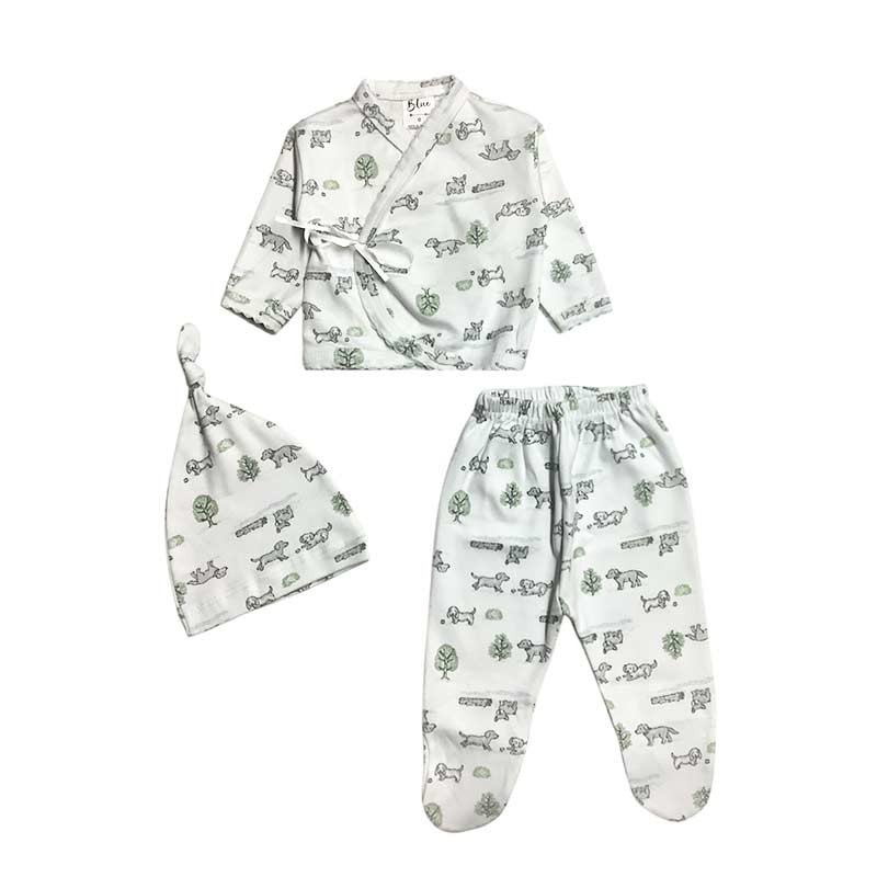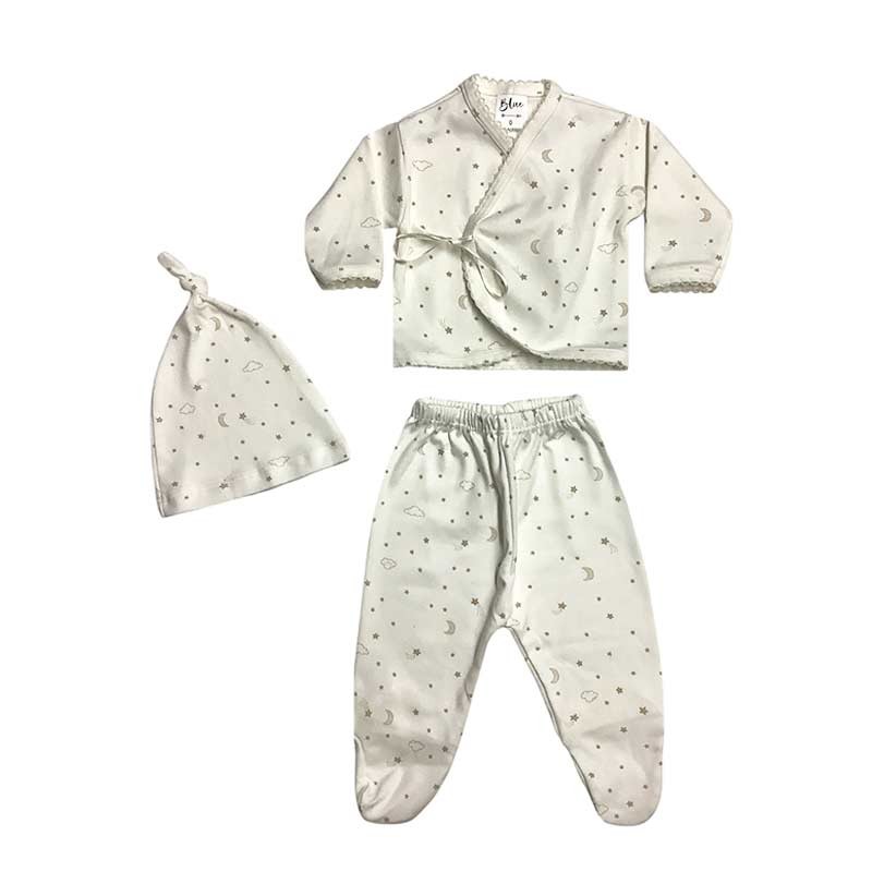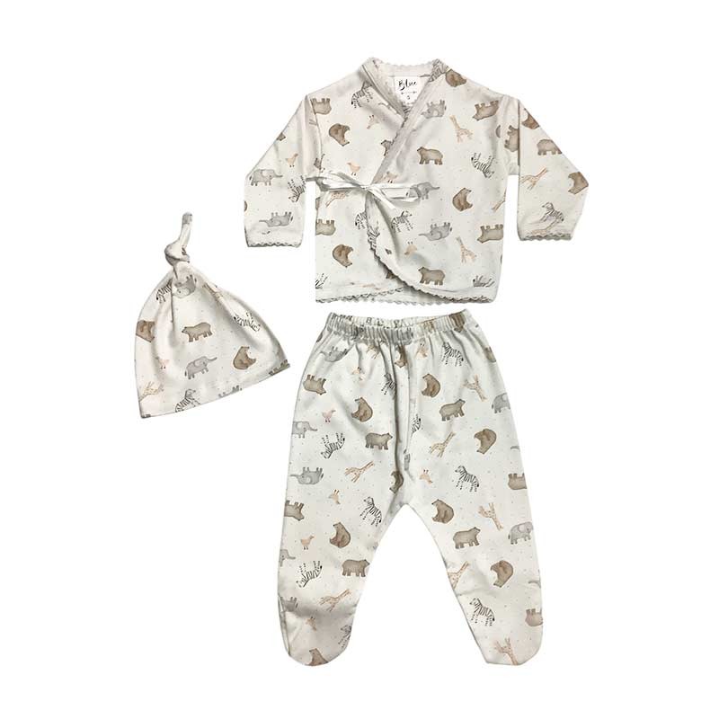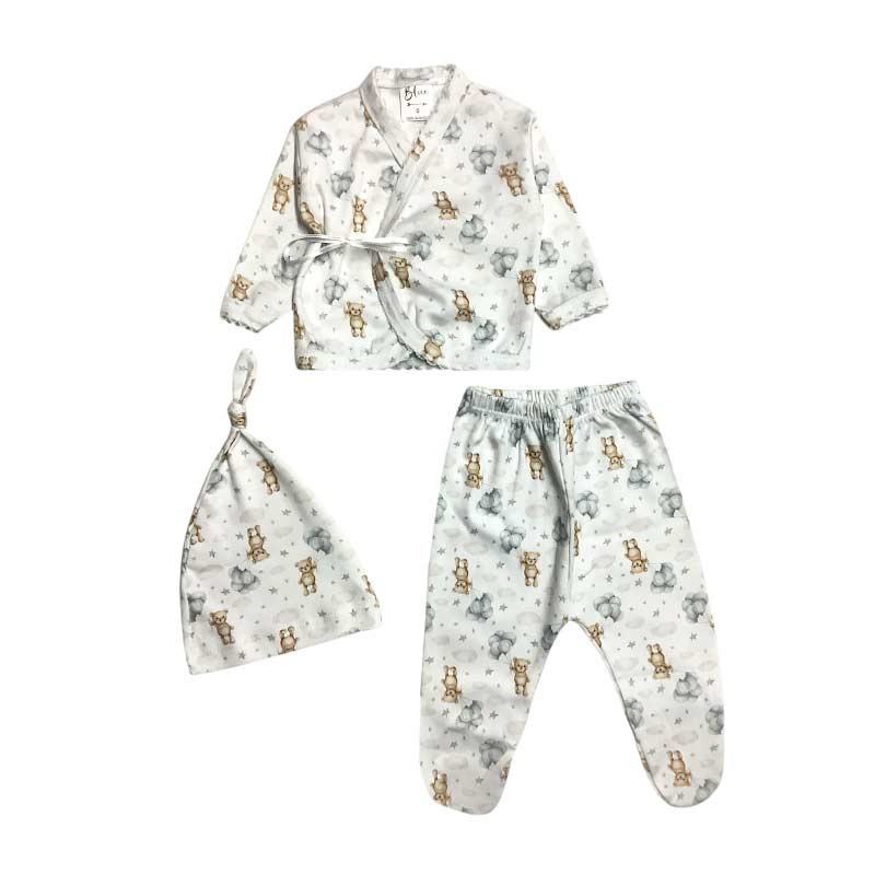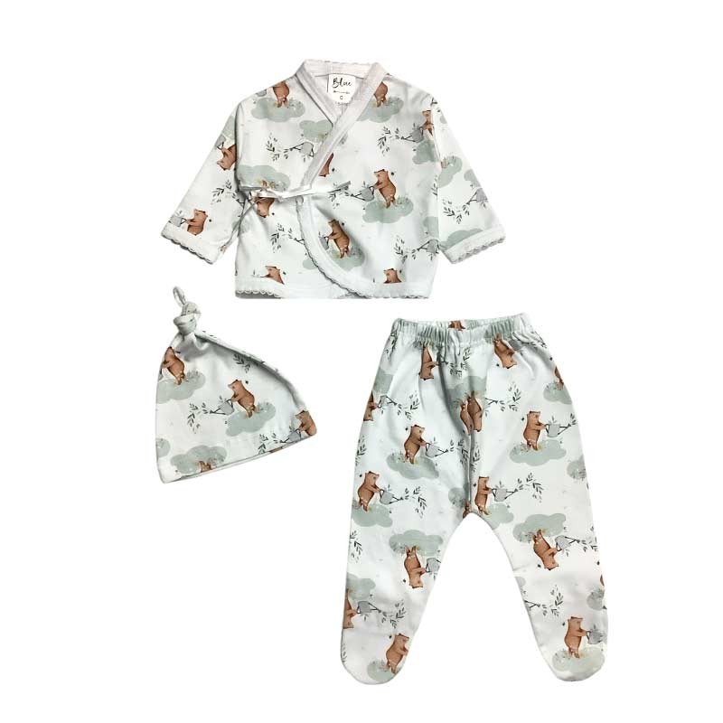 Set bebé/a 3 piezas estampado: batita c/cinta + medio osito + gorro. En bolsita de tul.