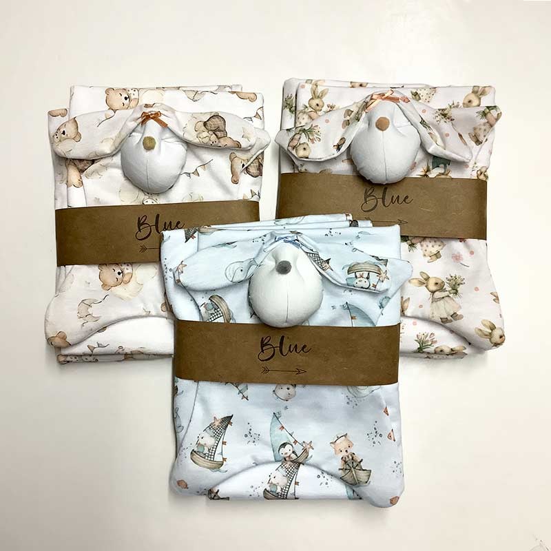 Set 2 piezas: manta algodon doble + sonajero conejito. ESTAMPADO ANIMALITOS