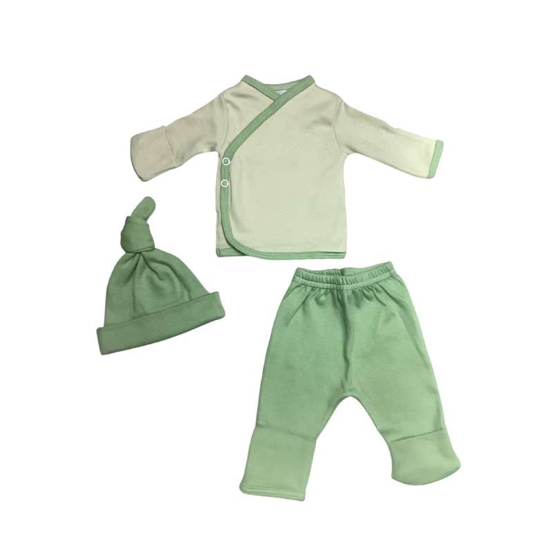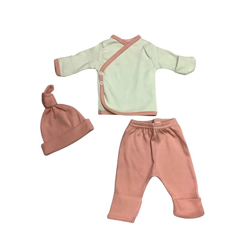 Set x3 piezas algodón liso: gorrito, pantalón liso y batita m/l c/broches y guantes opcionales.