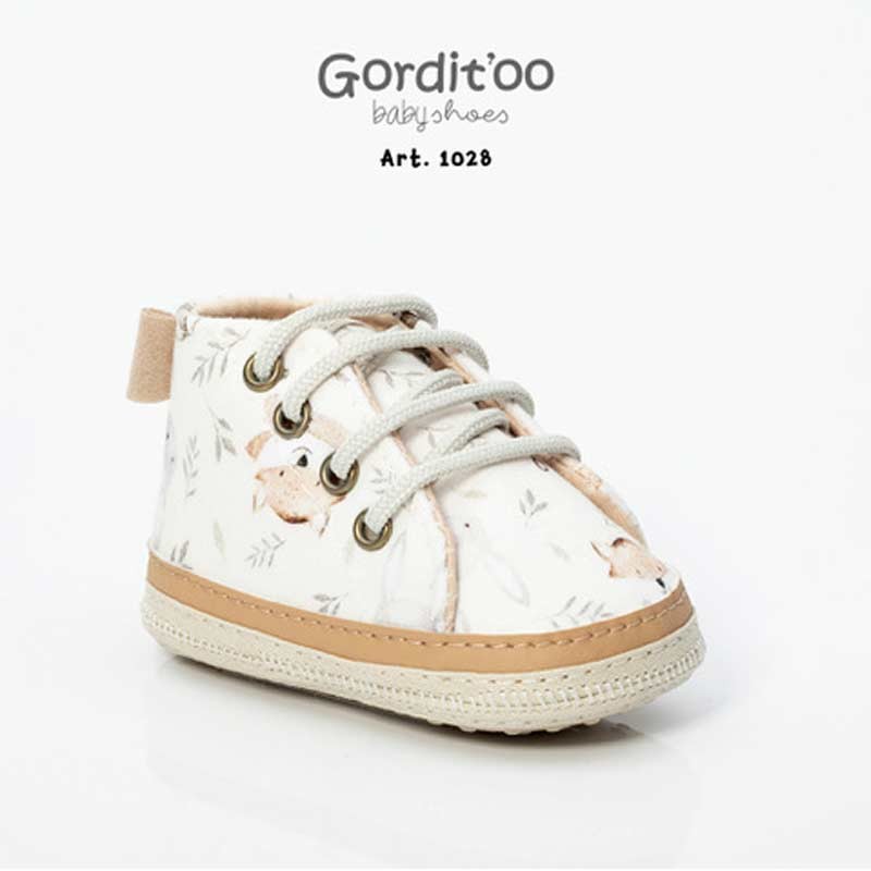 Zapatito botineta animalitos, con detalle beige y moño.
