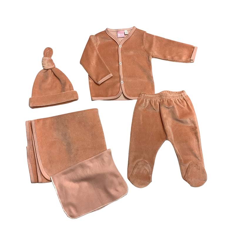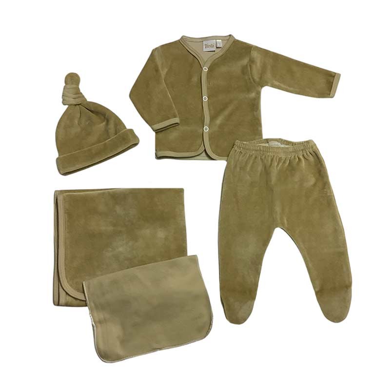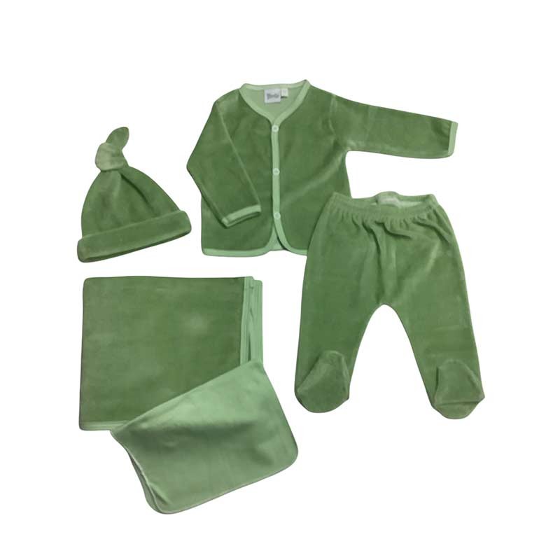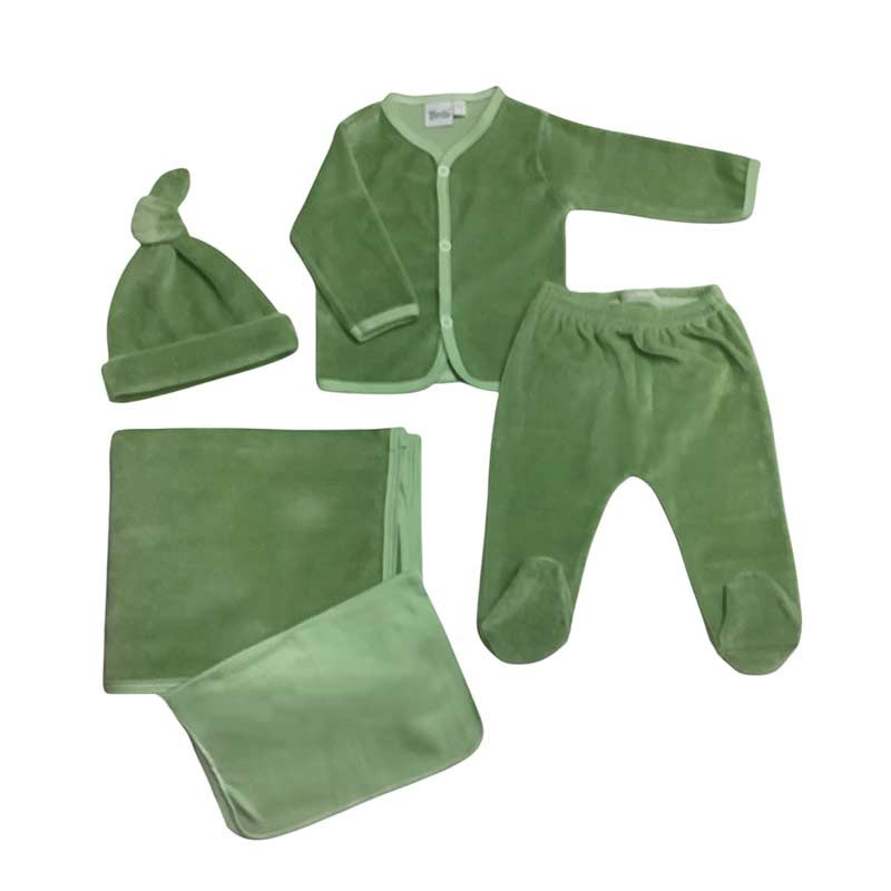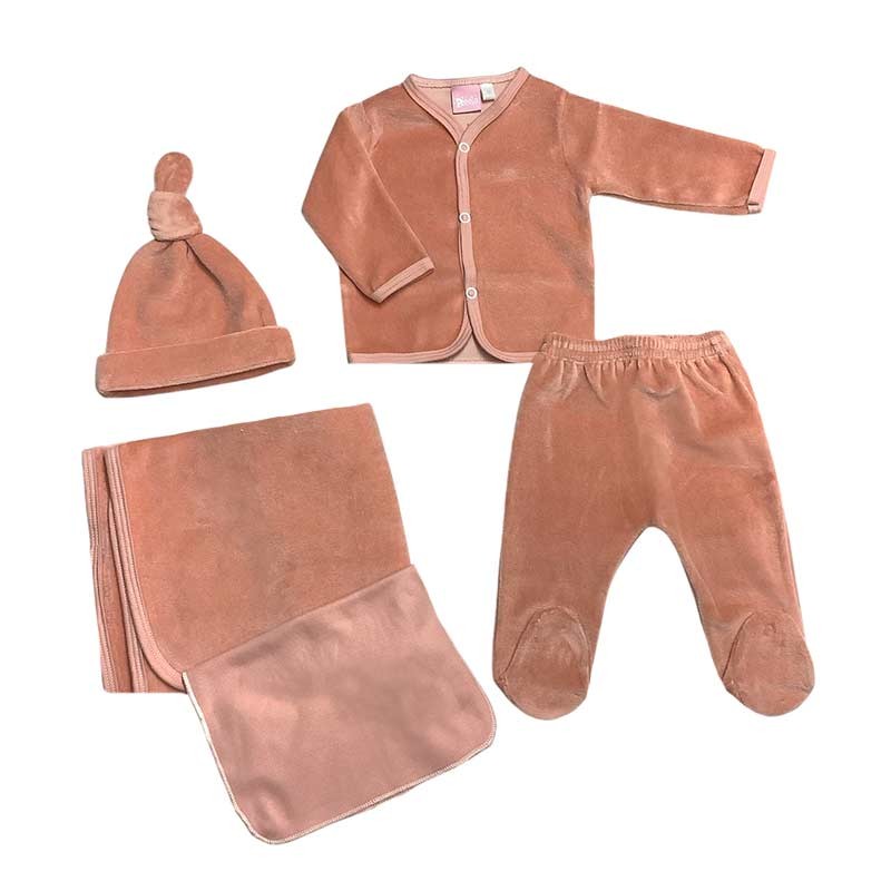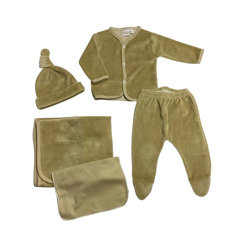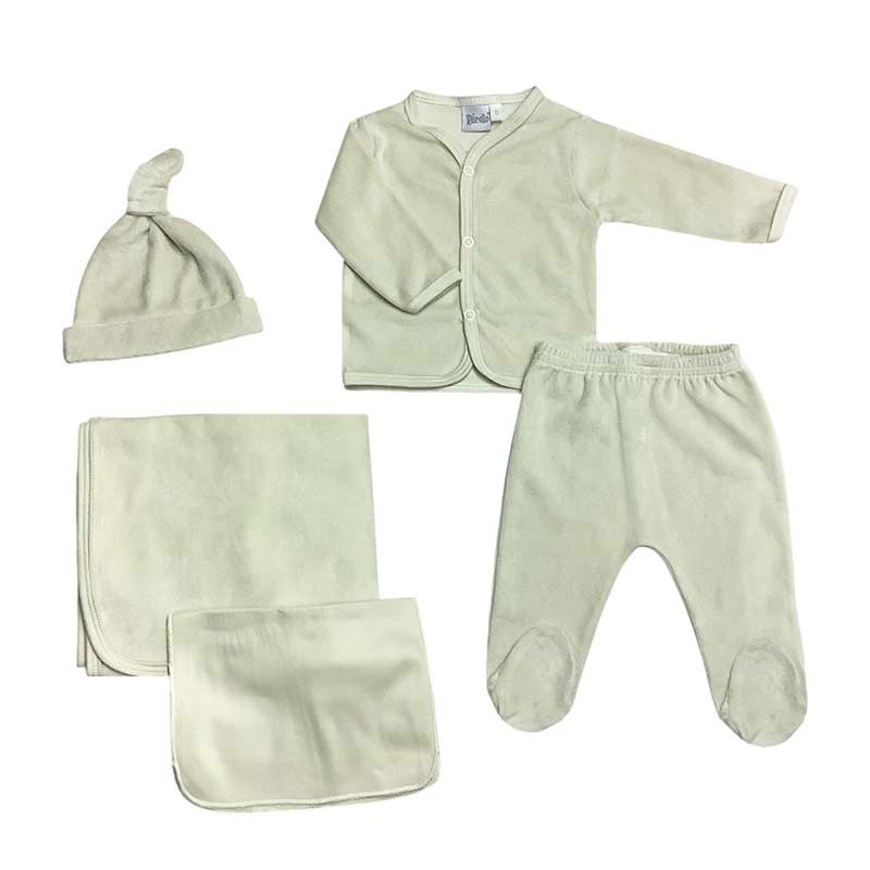 Ajuar de nacimiento 5 piezas plush liso: mantilla doble + body m/larga c/ guante opcional + medio osito + gorrito c/nudo + babita.