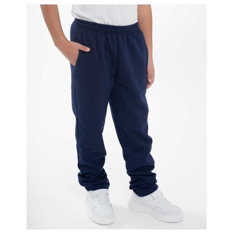 Pantalón de frisa azul con bolsillos laterales y cintura elastizada.