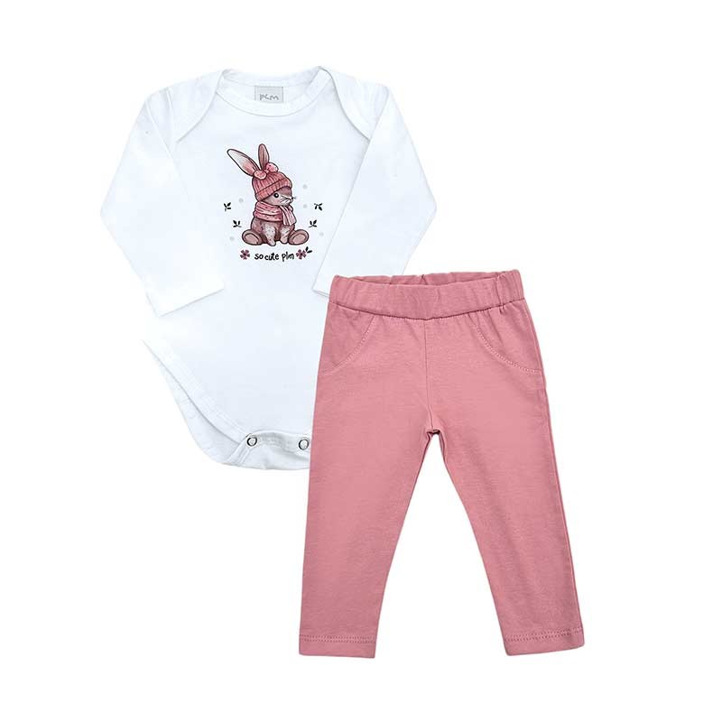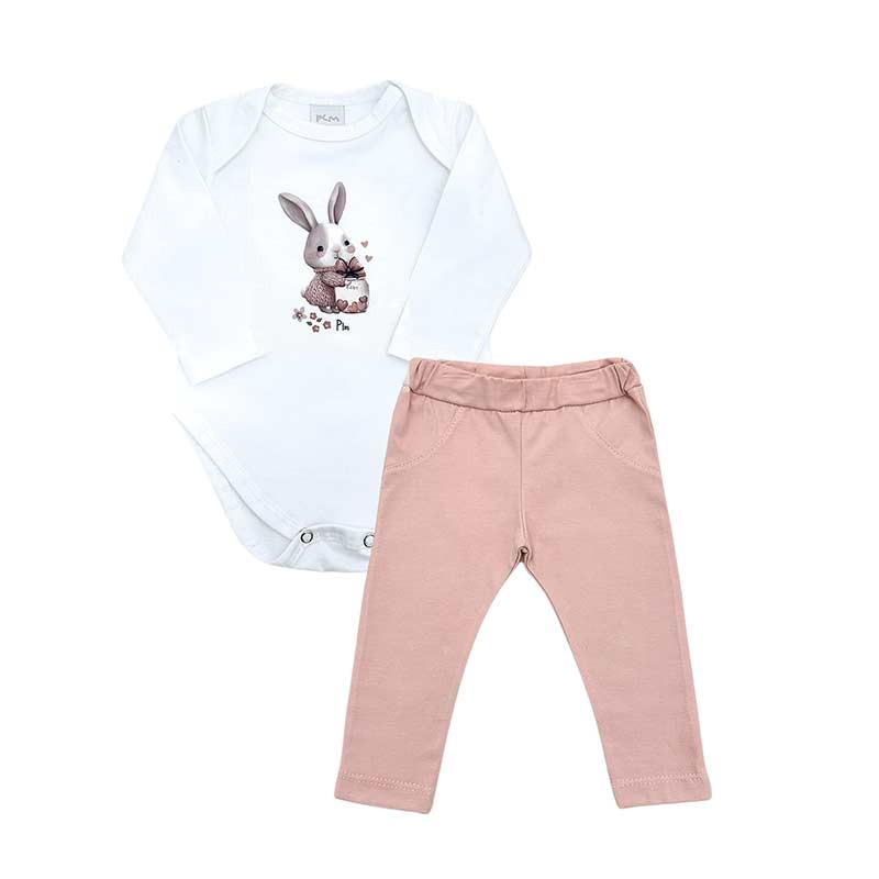 Conjunto beba algodón: body americano m/l con estampa conejita + pantalón liso.