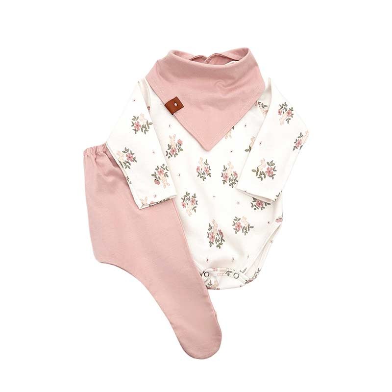 Set beba 3 piezas algodón: body m/l estampado + medio osito liso + bandana lisa.