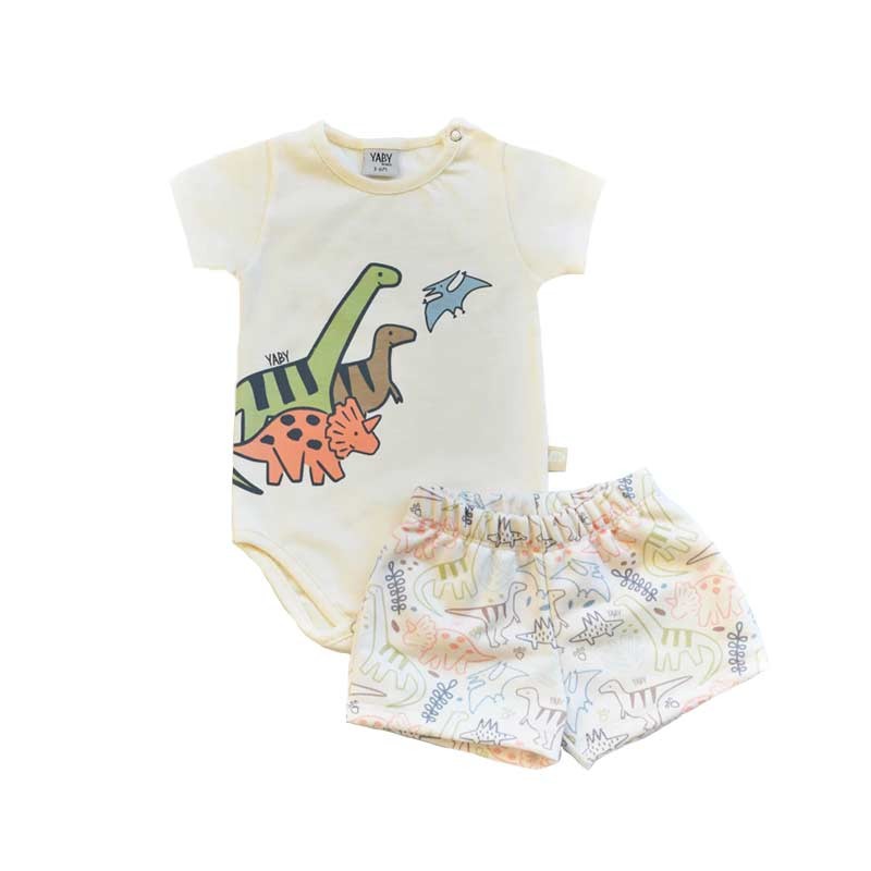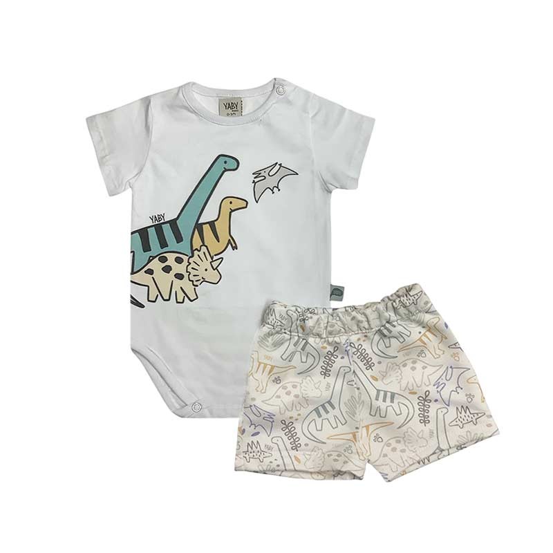 Conjunto bebé Dinos: body algodón manga corta c/estampa + short rústico estampado.