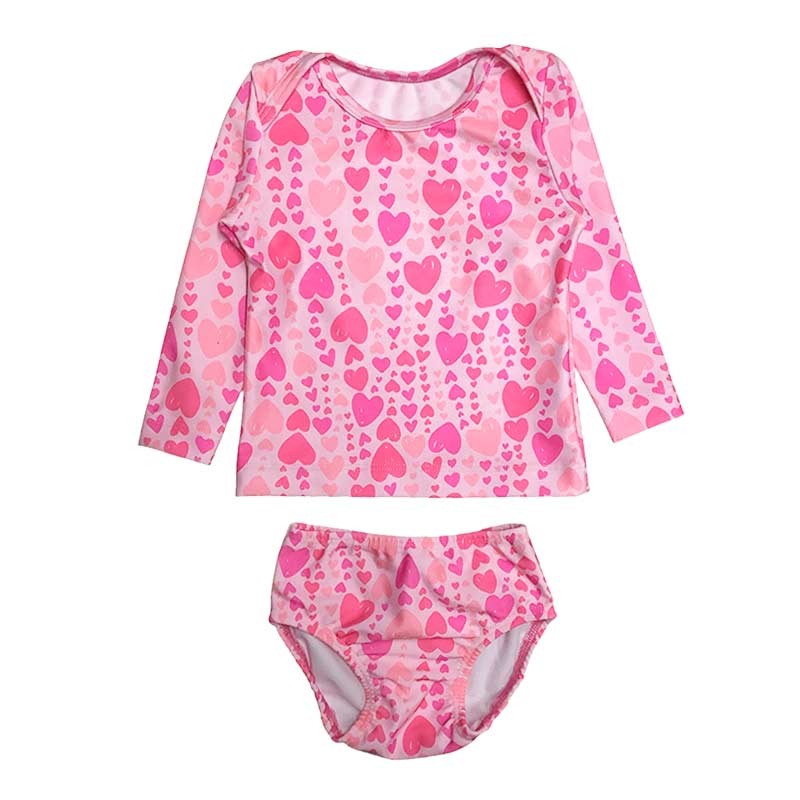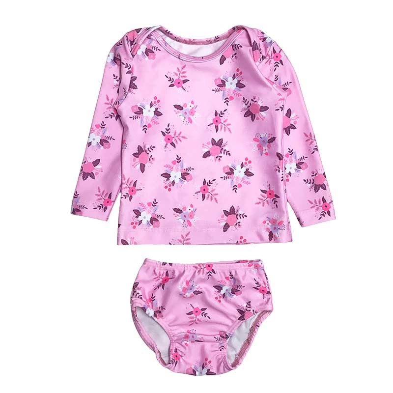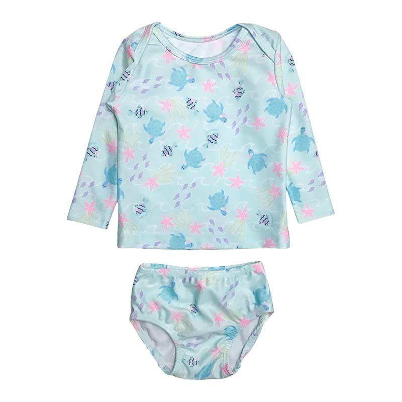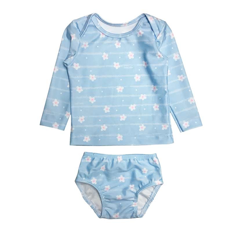 Conjunto UV beba tricot estampado: camiseta con cuello americano y bombacha.
