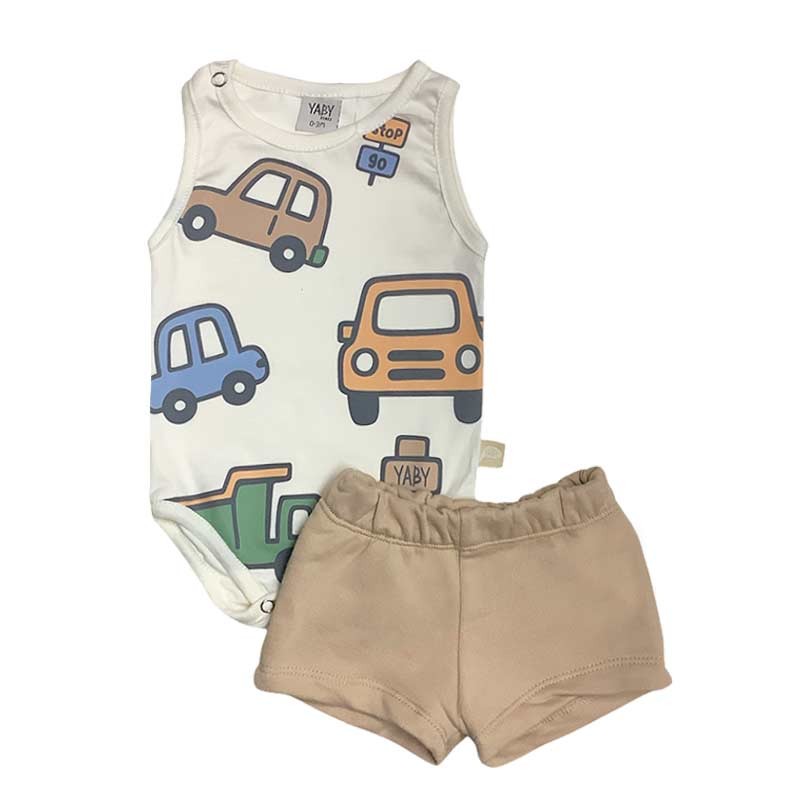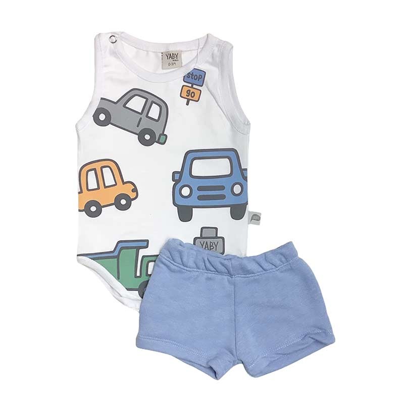 Conjunto bebé Vehículos: body algodón sin mangas c/estampa Vehículos + short rústico liso.