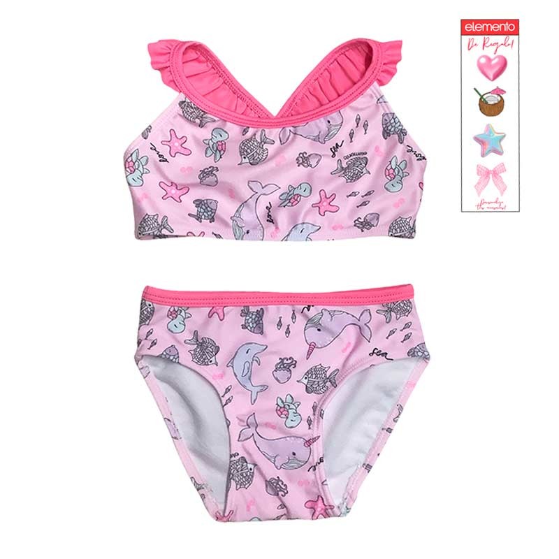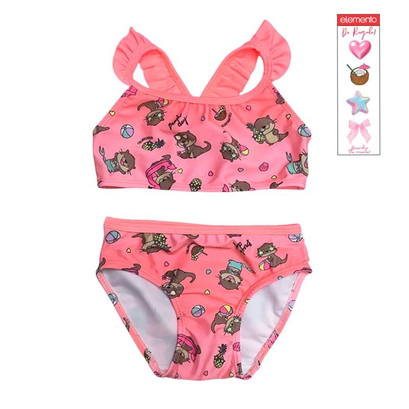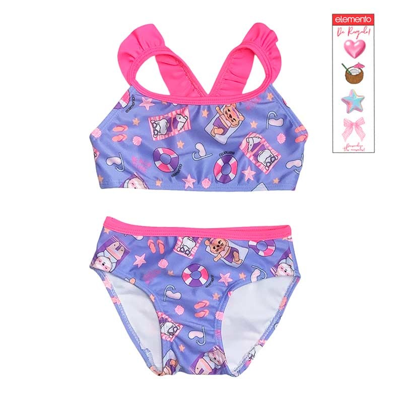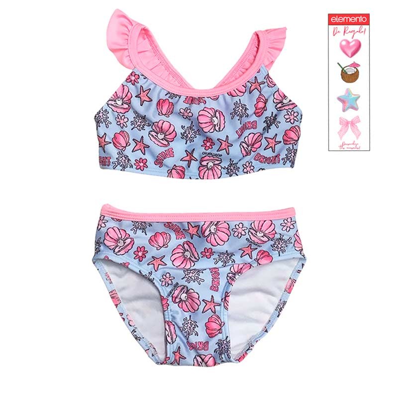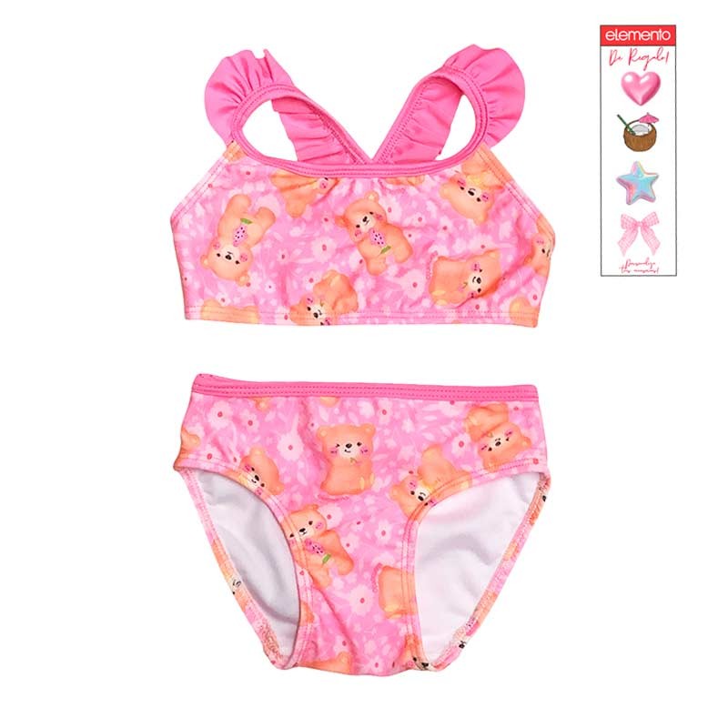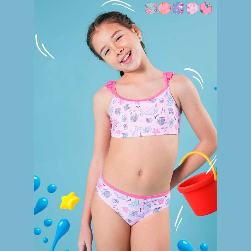 Bikini niña tricot estampado, top con breteles c/volados lisos en combinación.