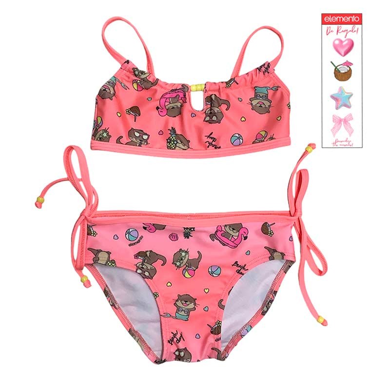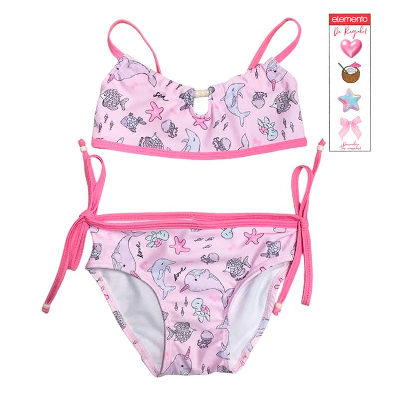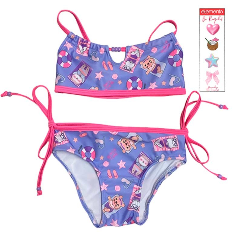 Bikini niña tricot estampado, top con detalle de canutillos, bombacha con tiras laterales.