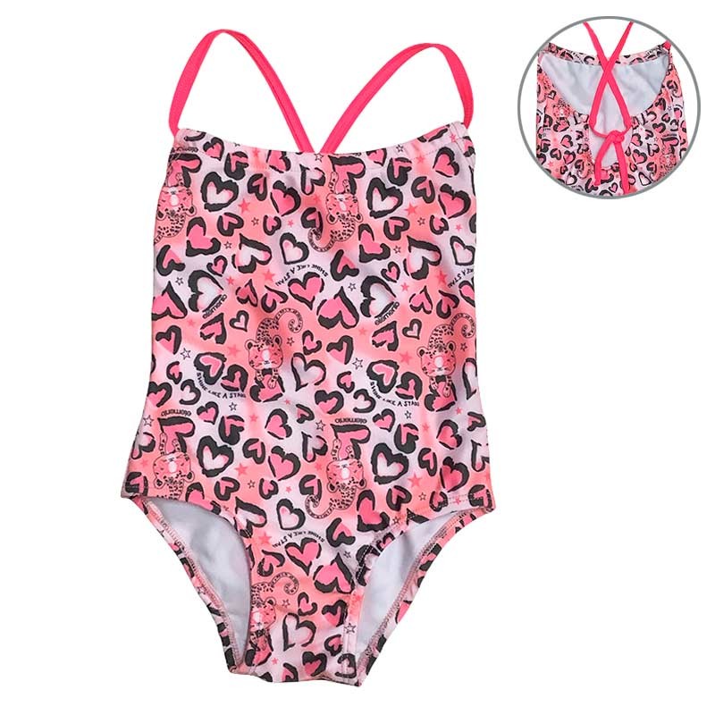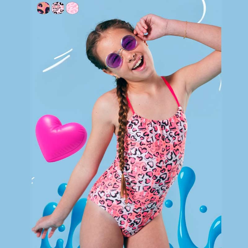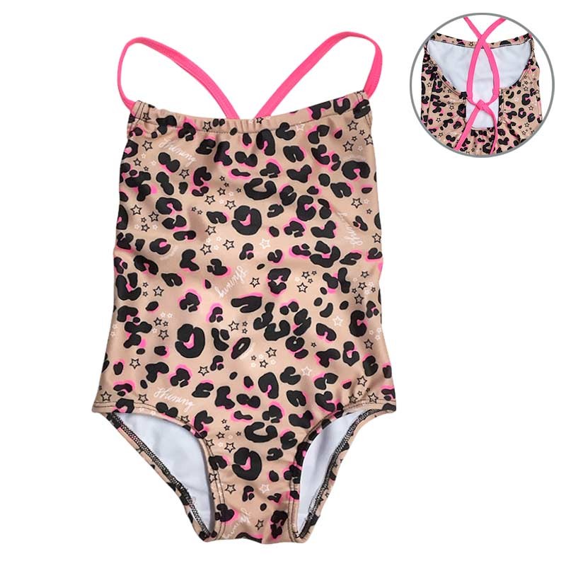 Malla enteriza niña tricot estampado con breteles finos cruzados en espalda. Linea animal print.