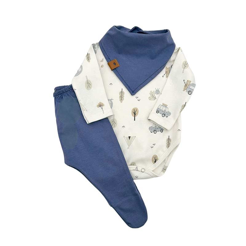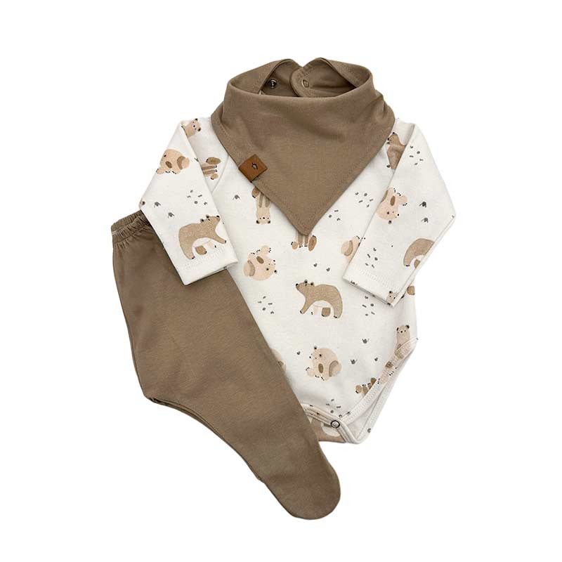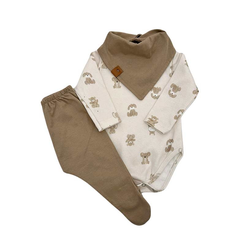 Conjunto bebé 3 piezas algodón: body m/l estampado + medio osito + bandana.