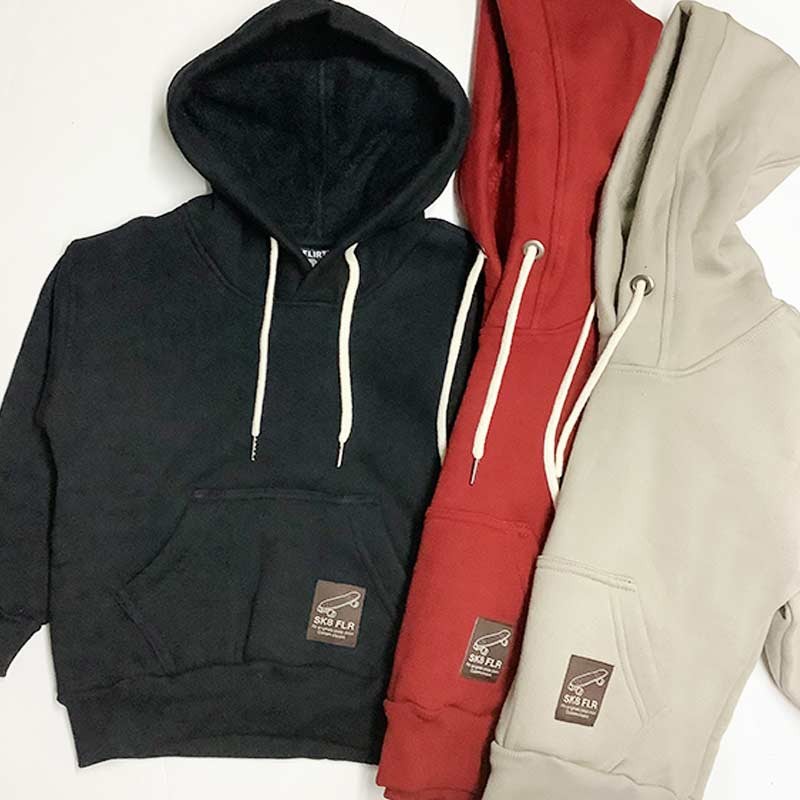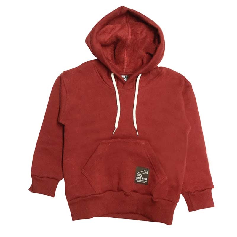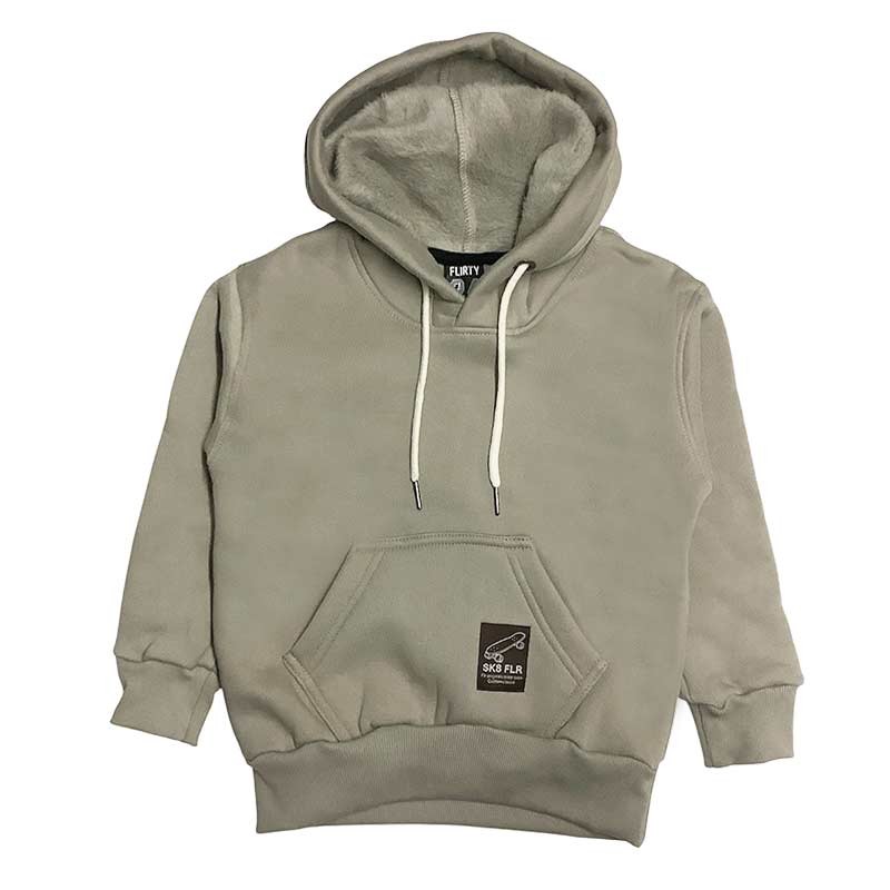 Buzo canguro niño frisa visón liso, con detalle etiqueta en bolsillo y capucha c/cordón.
