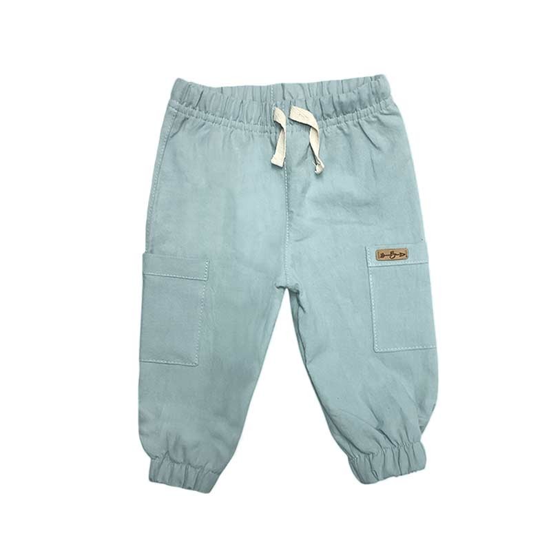 Pantalón bebé tussor liso, bolsillos con detalle aplique, puños elásticos, y cordón en cintura.