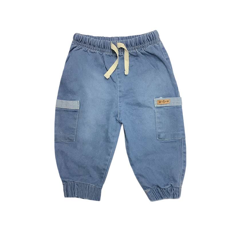 Pantalón mini bebé jean elastizado, con bolsillos cargo, puños elásticos, y cordón en cintura.