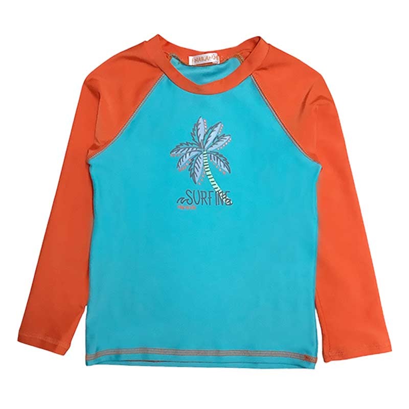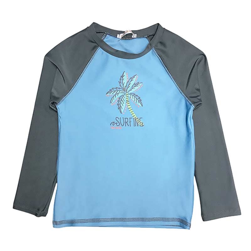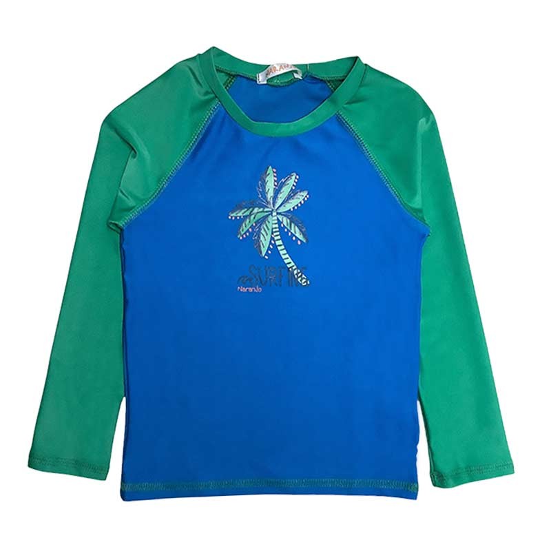 Remera niño m/largas combinada, con estampa Palmera. Tela con protección UV.