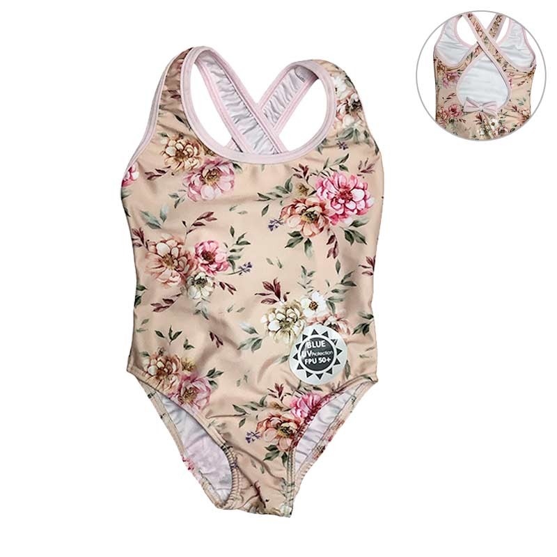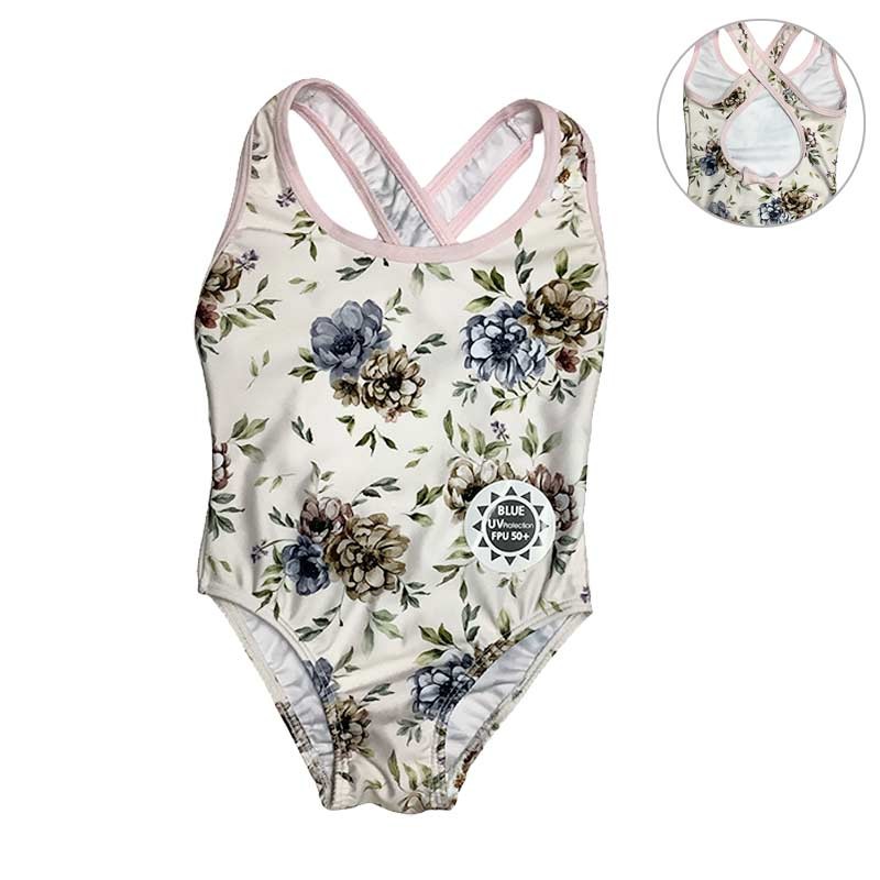 Malla enteriza niña lycra estampada. Clásica con tiras cruzadas en espalda, con moñito. ESTAMPADO FLORES