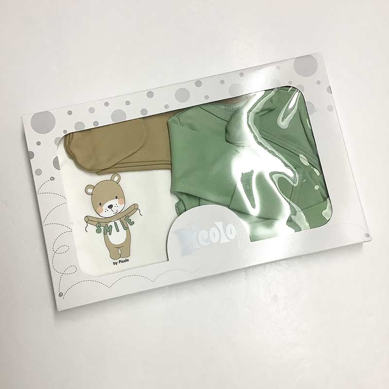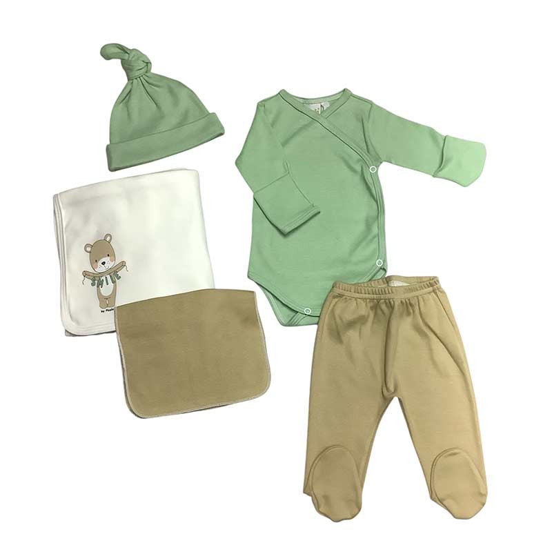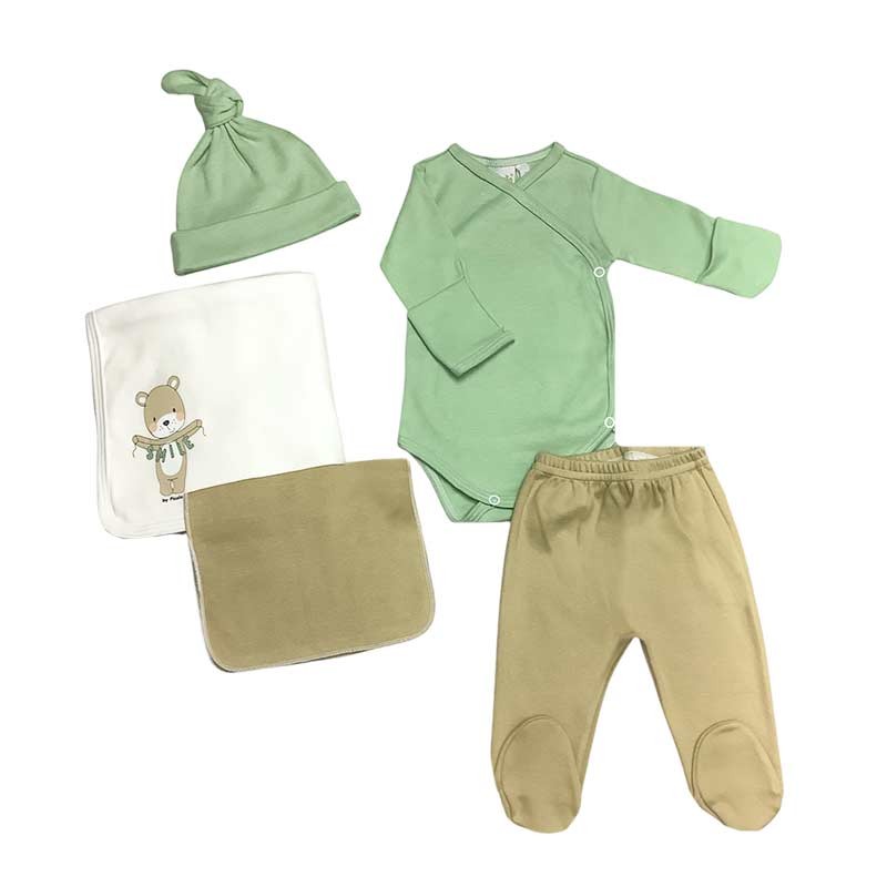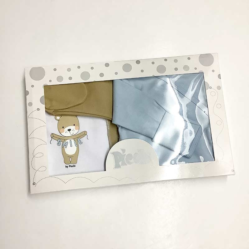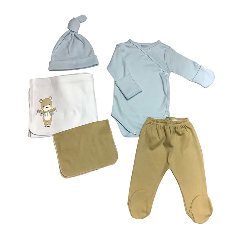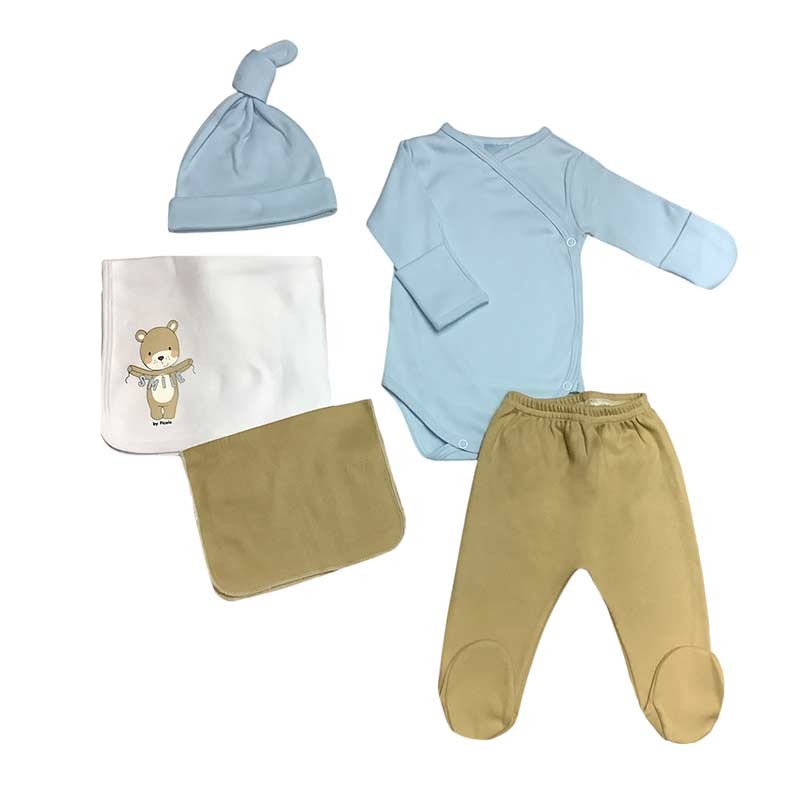 Ajuar de nacimiento 5 piezas algodón: mantilla doble estampada + body m/larga c/ guante opcional liso + medio osito + gorrito c/nudo + babita. ESTAMPADO OSITO SMILE