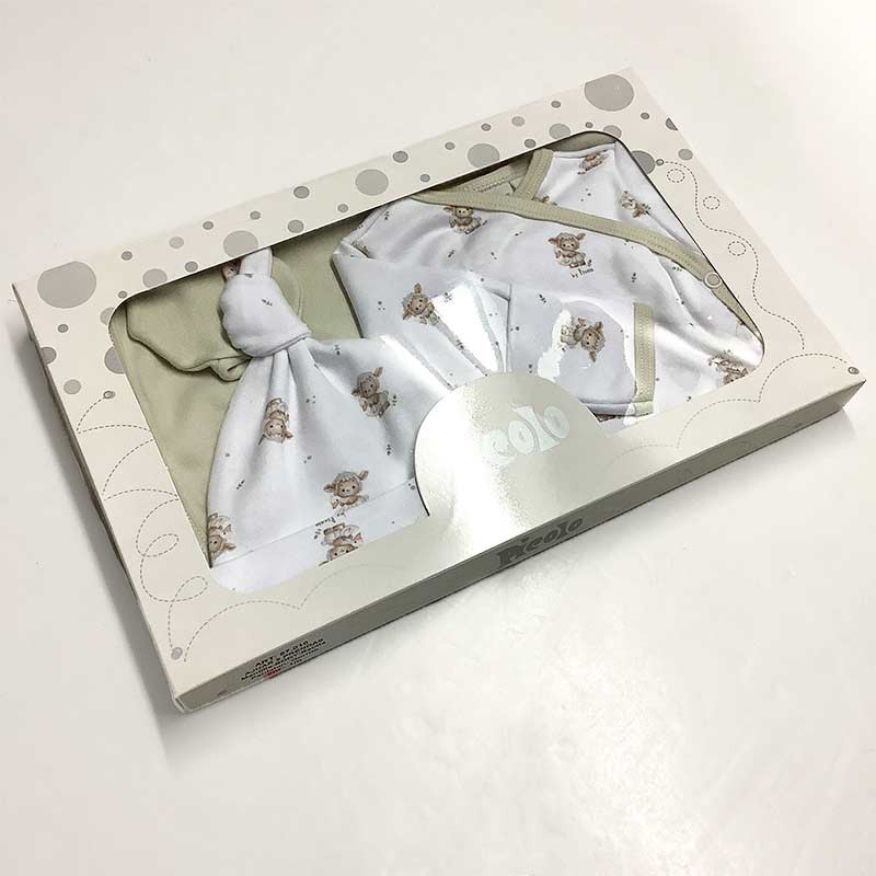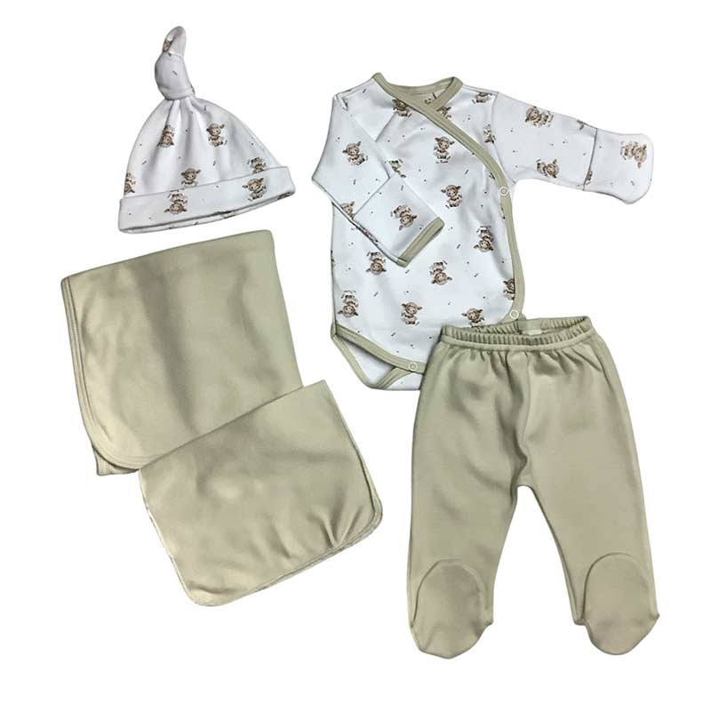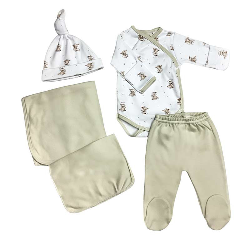 Ajuar de nacimiento 5 piezas algodón: mantilla doble lisa + body m/larga c/ guante opcional + medio osito + gorrito c/nudo + babita. ESTAMPADO OVEJAS
