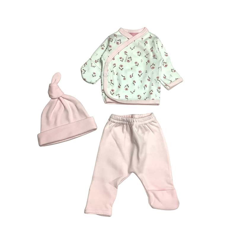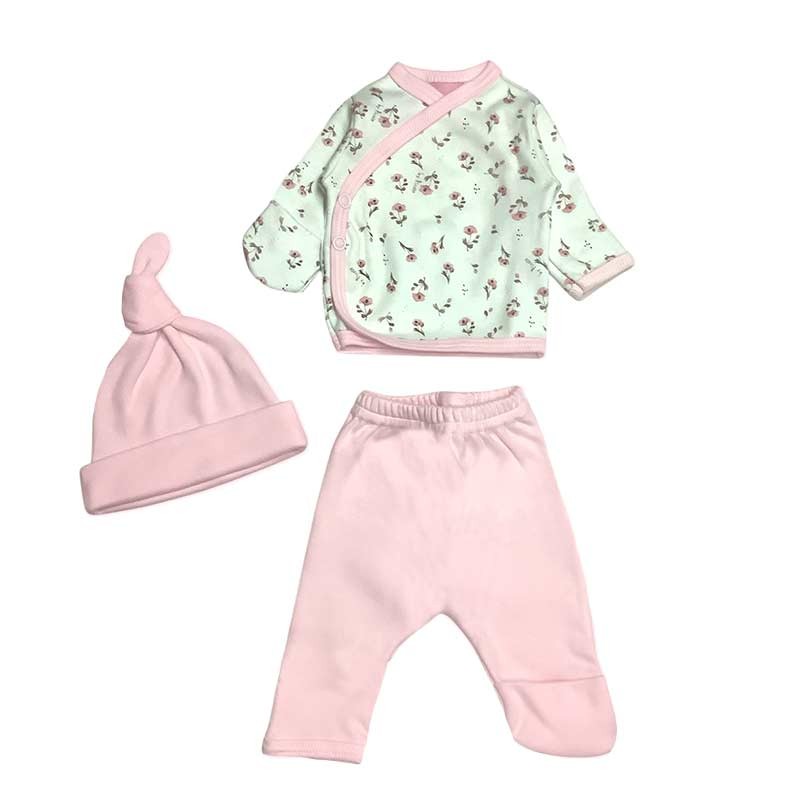Set x3 piezas algodón flores: gorrito, pantalón liso y batita m/l c/broches y guantes opcionales.