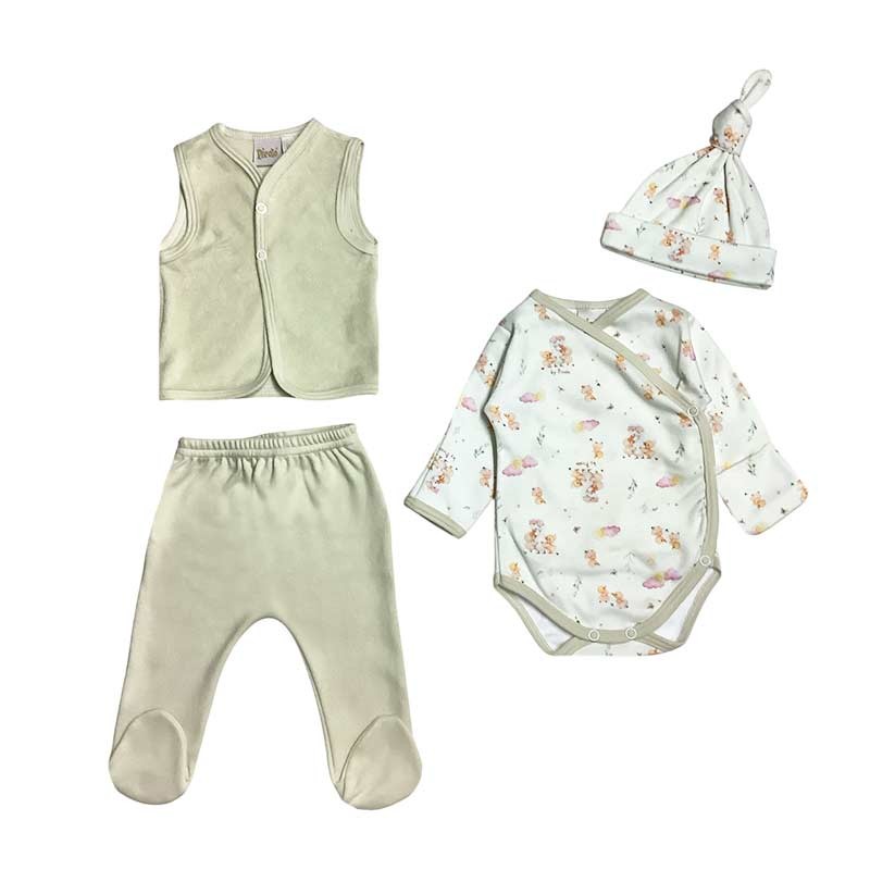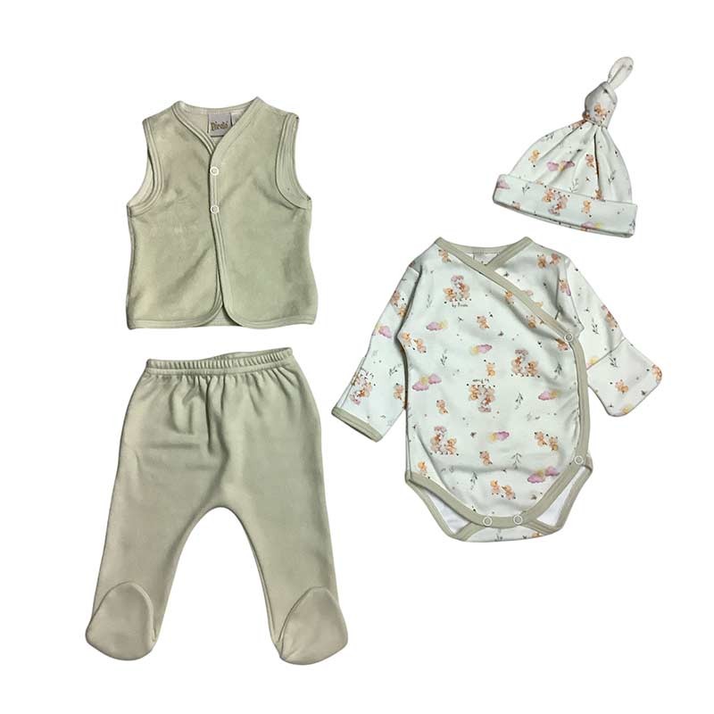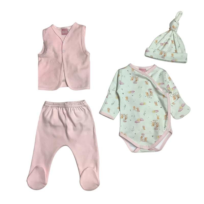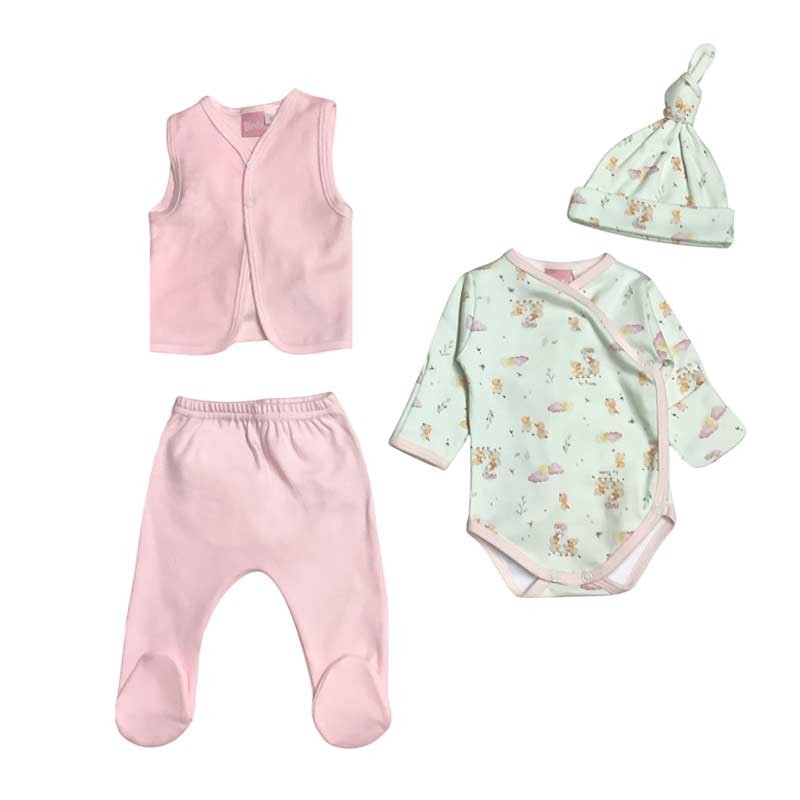 Set 4 piezas Flores: body m/l con guantes y gorrito de algodón estampado, chaleco plush y medio osito liso.