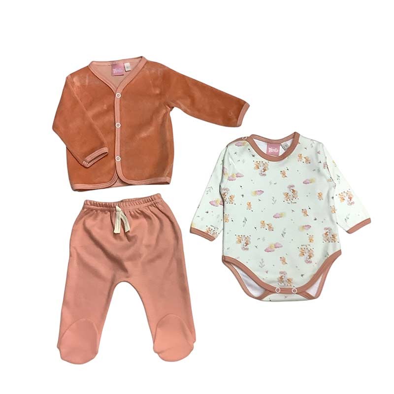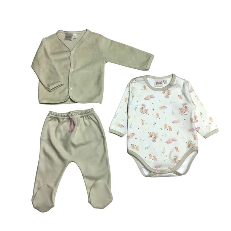 Set x3 piezas algodón: body m/l estampa patitos + saquito c/broches + medio osito c/detalle moño.