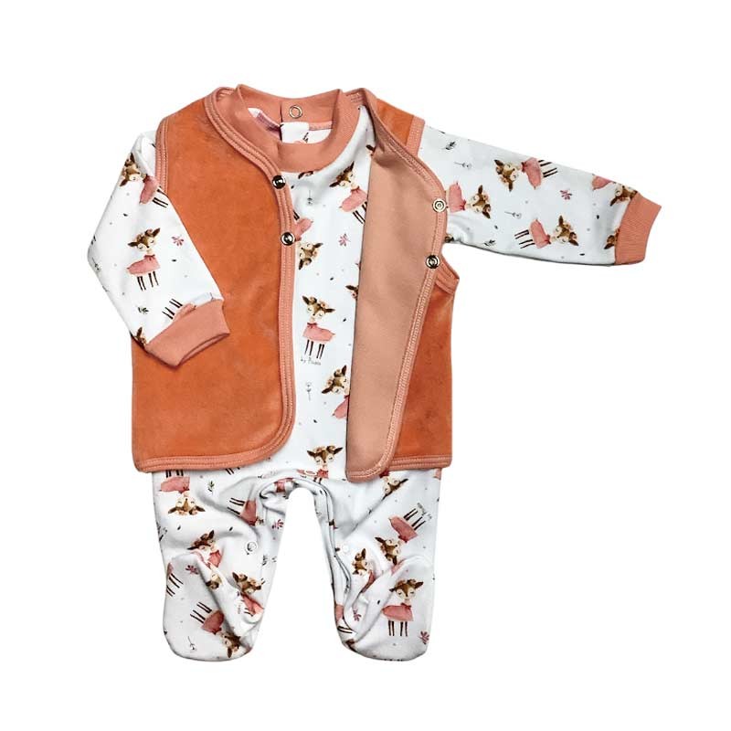 Enterito interlock estampado + chaleco plush liso c/broches.Â