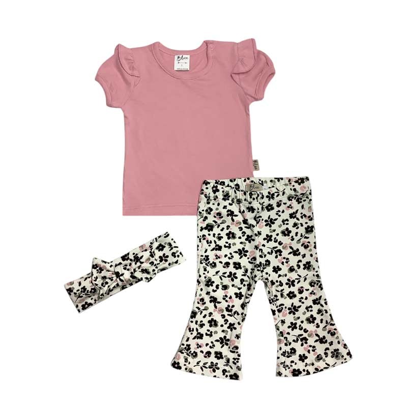 Set x 3 piezas beba algodón: remera lisa c/voladitos en manga + calza oxford + vincha con moño. ESTAMPADO FLORES