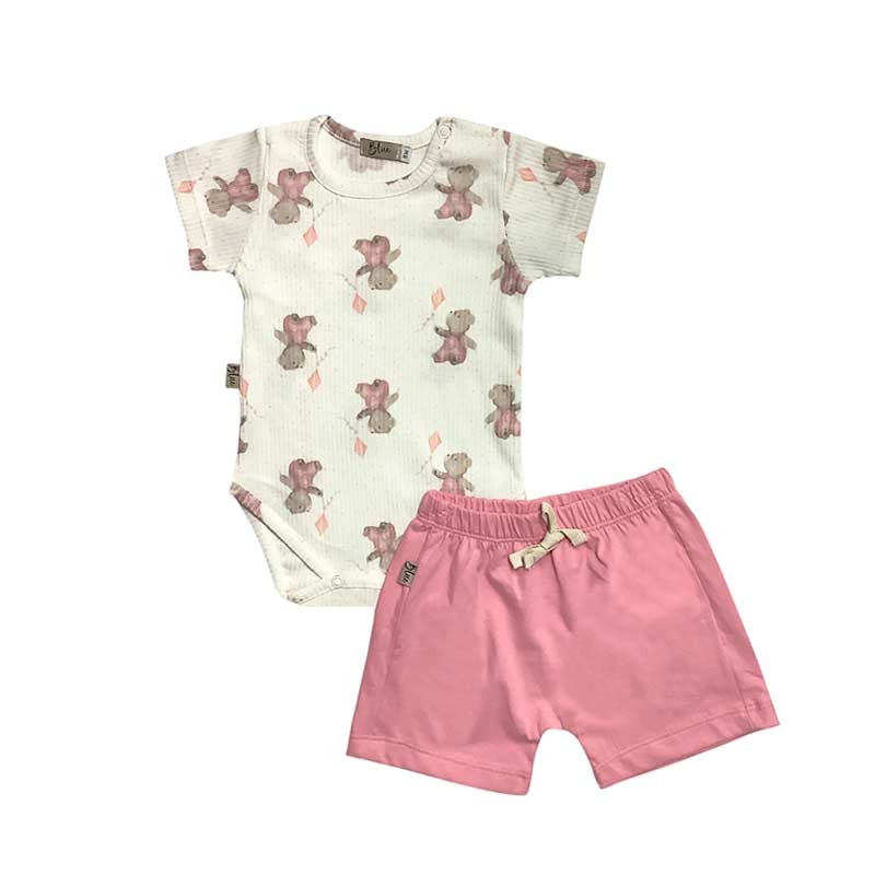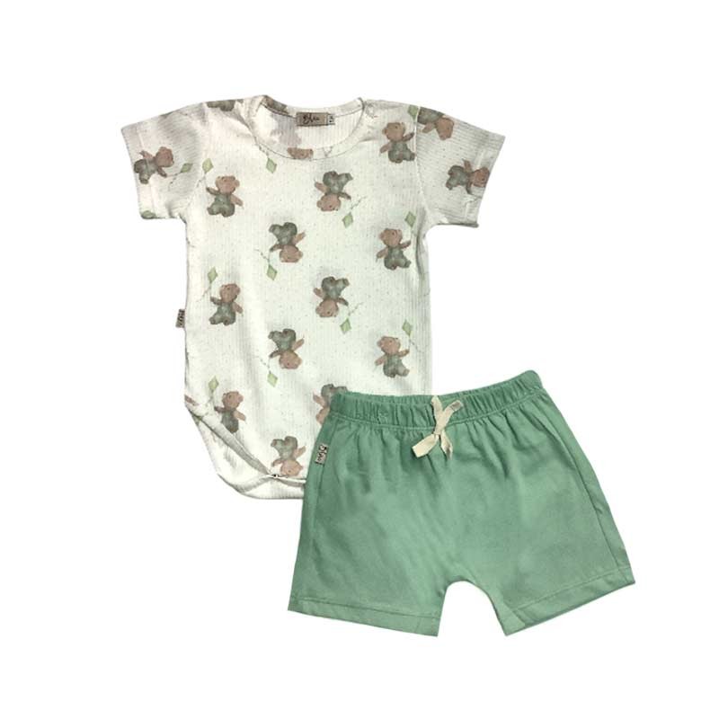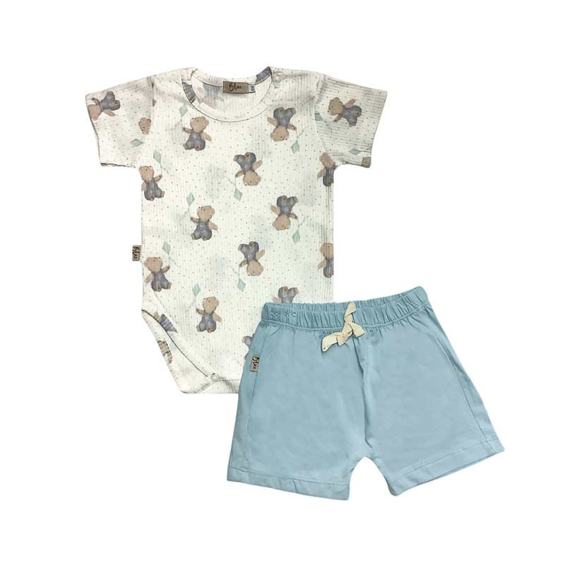 Conjunto mini bebé/a 2 piezas algodón acanalado: body m/c con broches estampado + short liso con detalle nudo. ESTAMPADO OSITOS