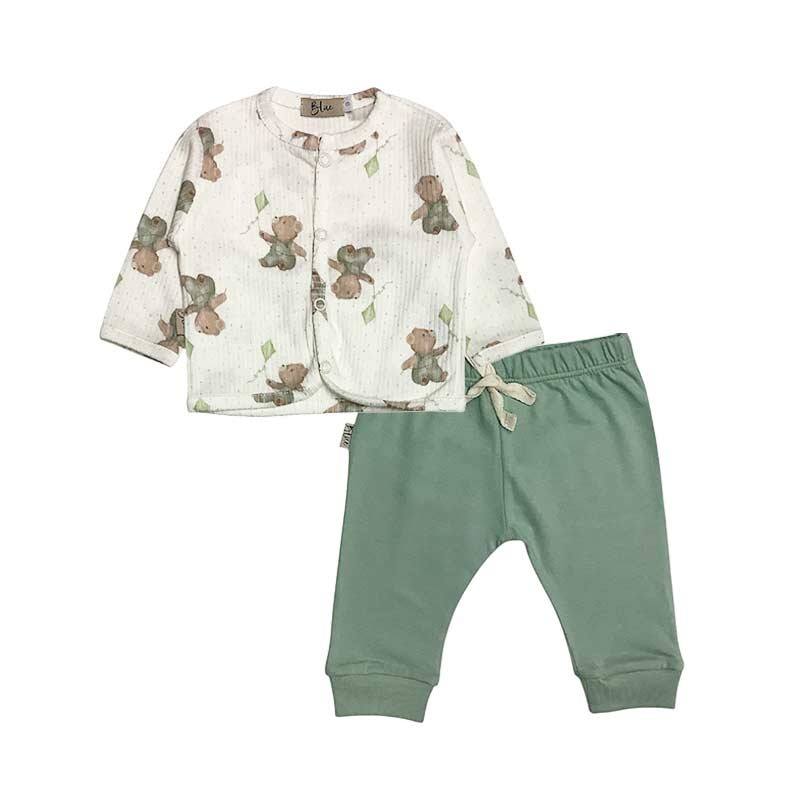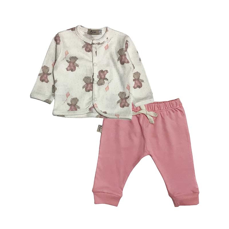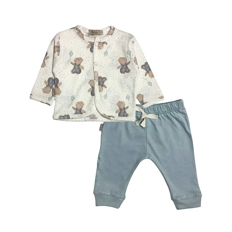 Conjunto mini bebé/a: saquito algodón acanalado estampado Ositos c/broches + babucha lisa c/puños y detalle cordón.