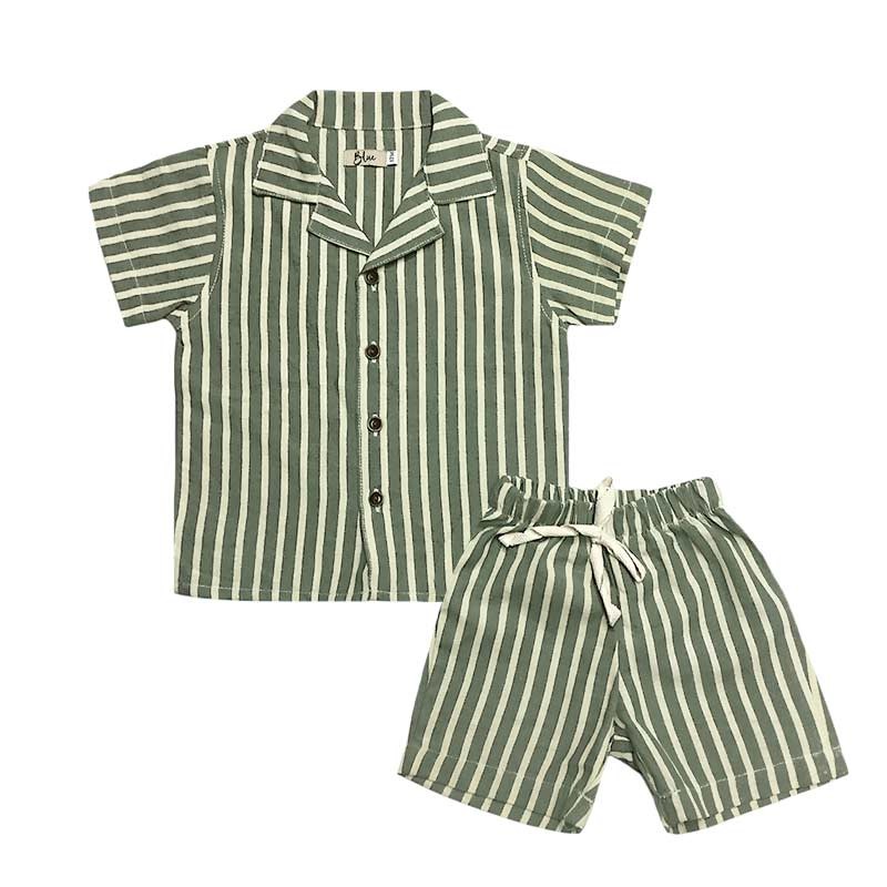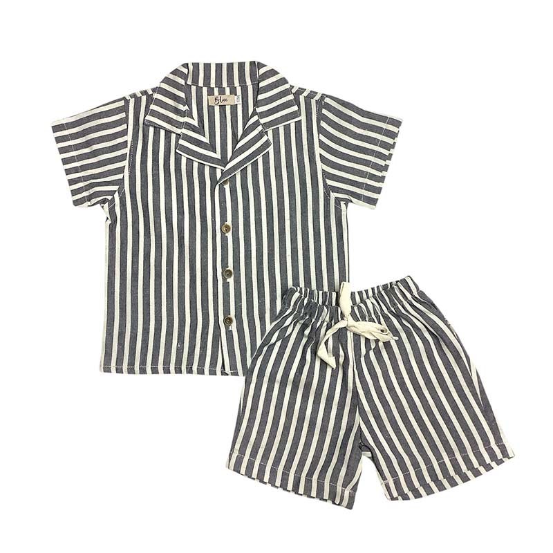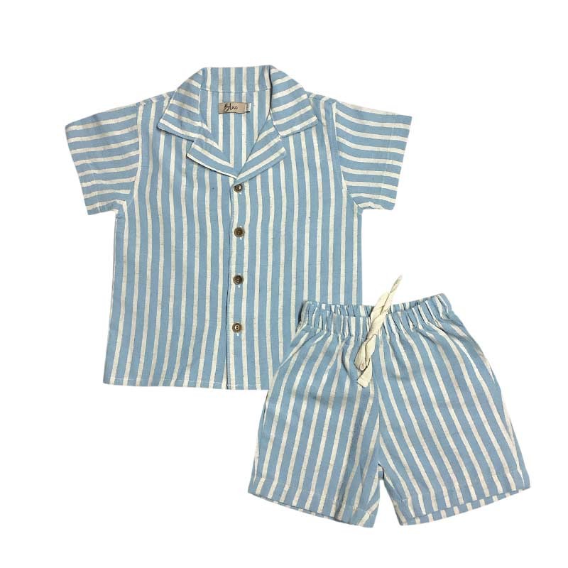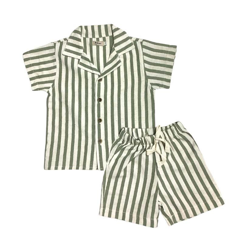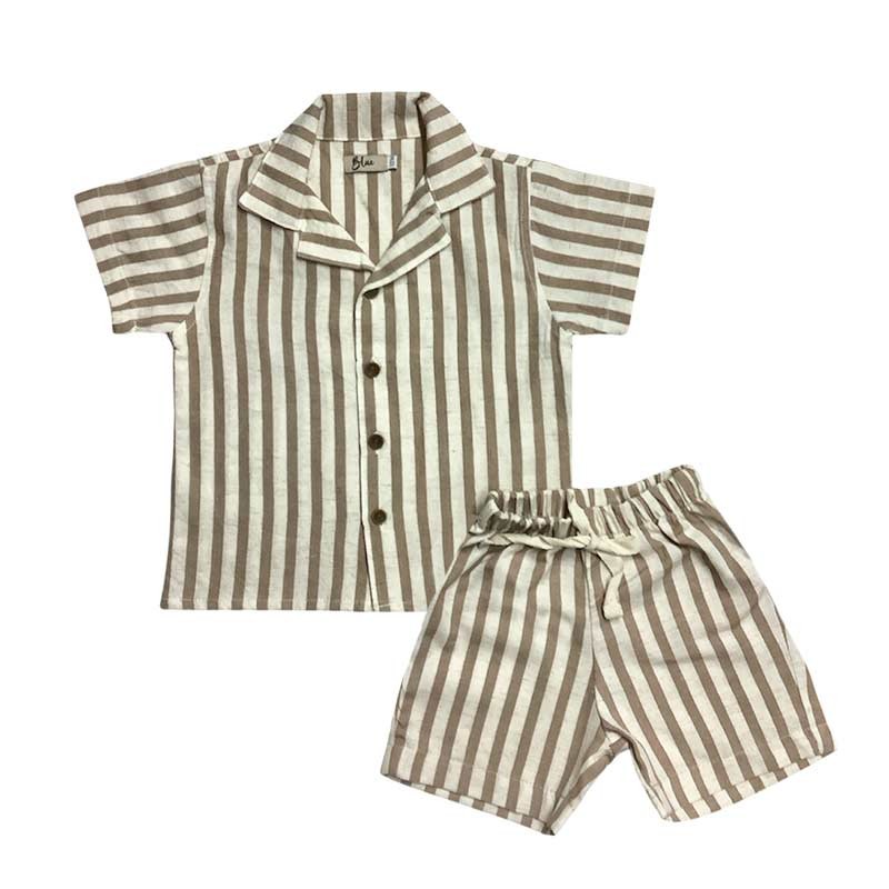 Conjunto bebé lino rayado: camisa rayada m/c con bolsillo + short con cordón.