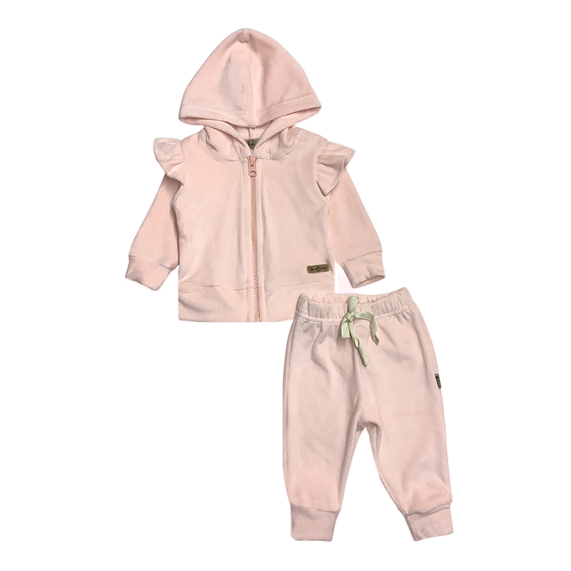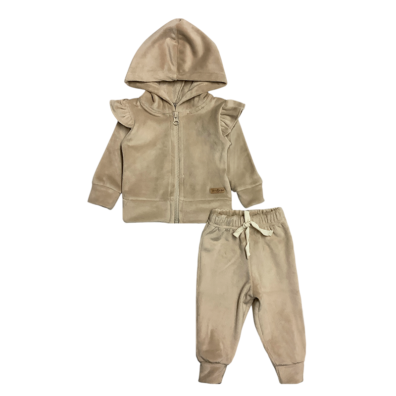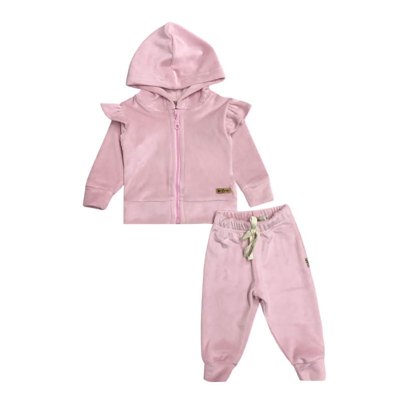 Conjunto beba plush premium super soft: Campera beba con puños, capucha y volados en hombros y pantalón con cordon.