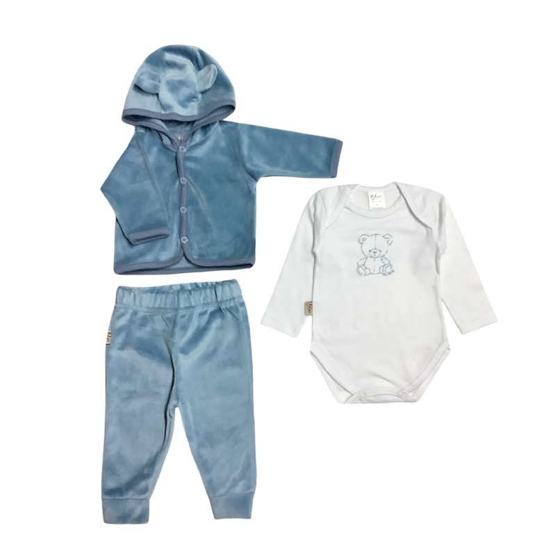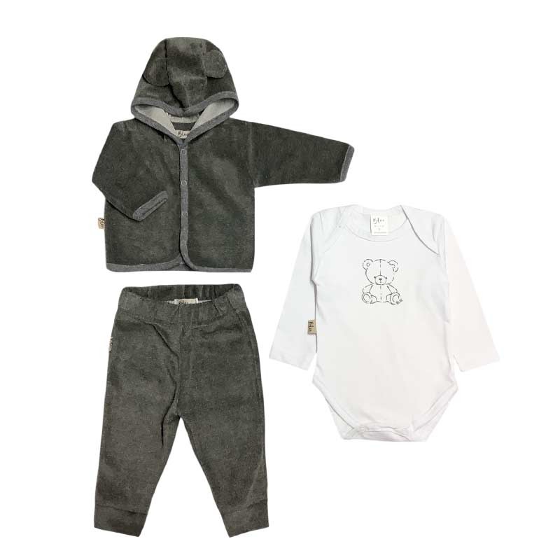 Set x 3 piezas de plush: Body m/larga estampado Osito + saquito con capucha y broches + pantalón c/puño con cintura.