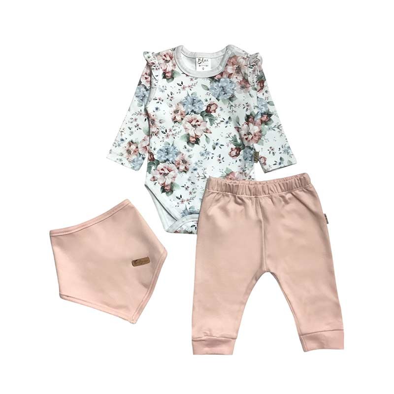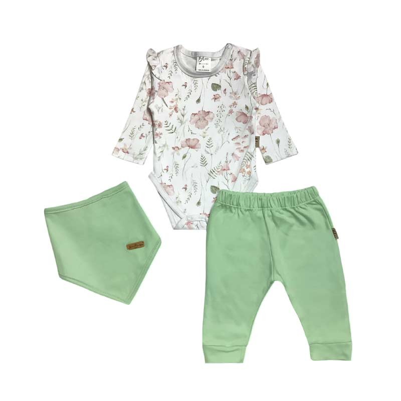 Set beba 3 piezas algodon: body algodón m/l con voladitos, pantalón c/puño y babero bandana.