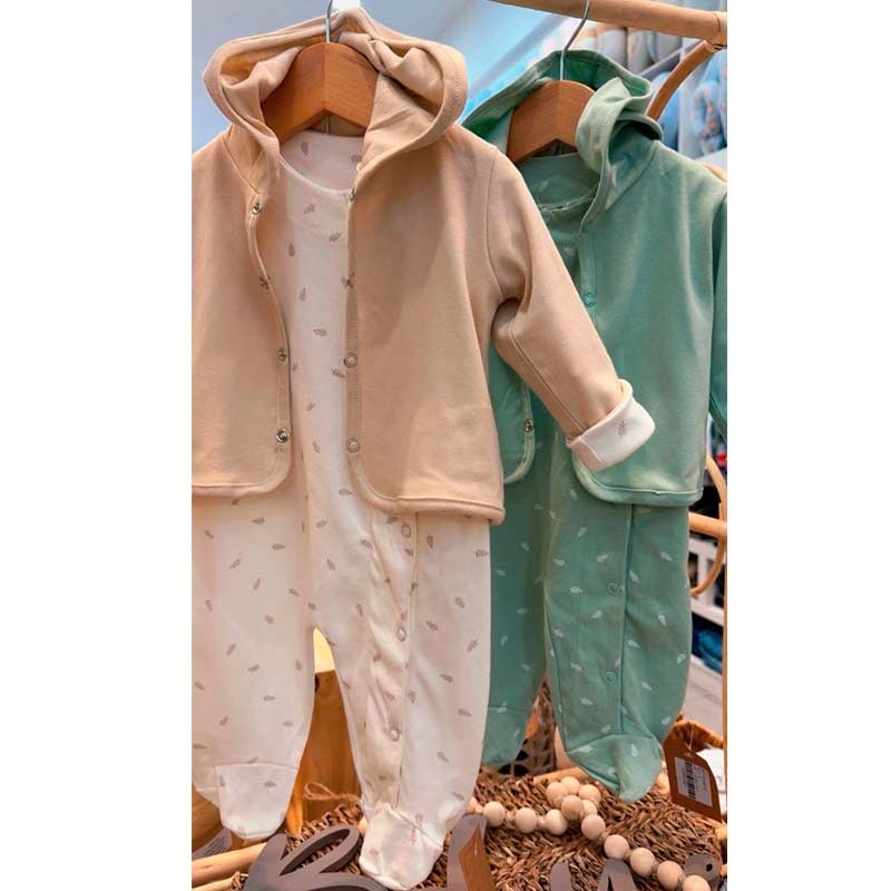 Conjunto bebé/a algodón: enterito con broches de costado estampado hojas + saquito liso con broches y capucha.