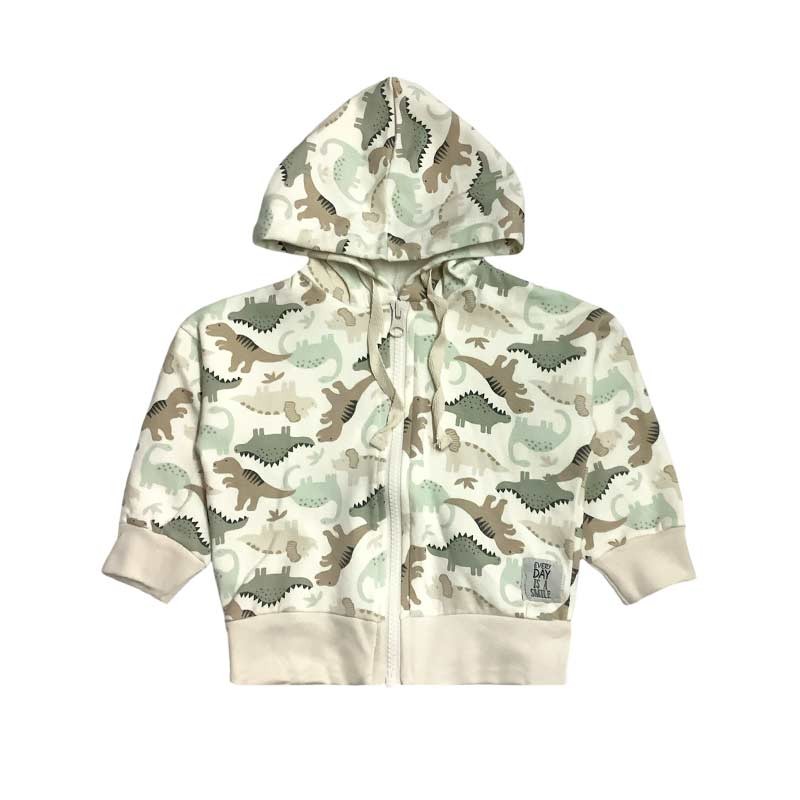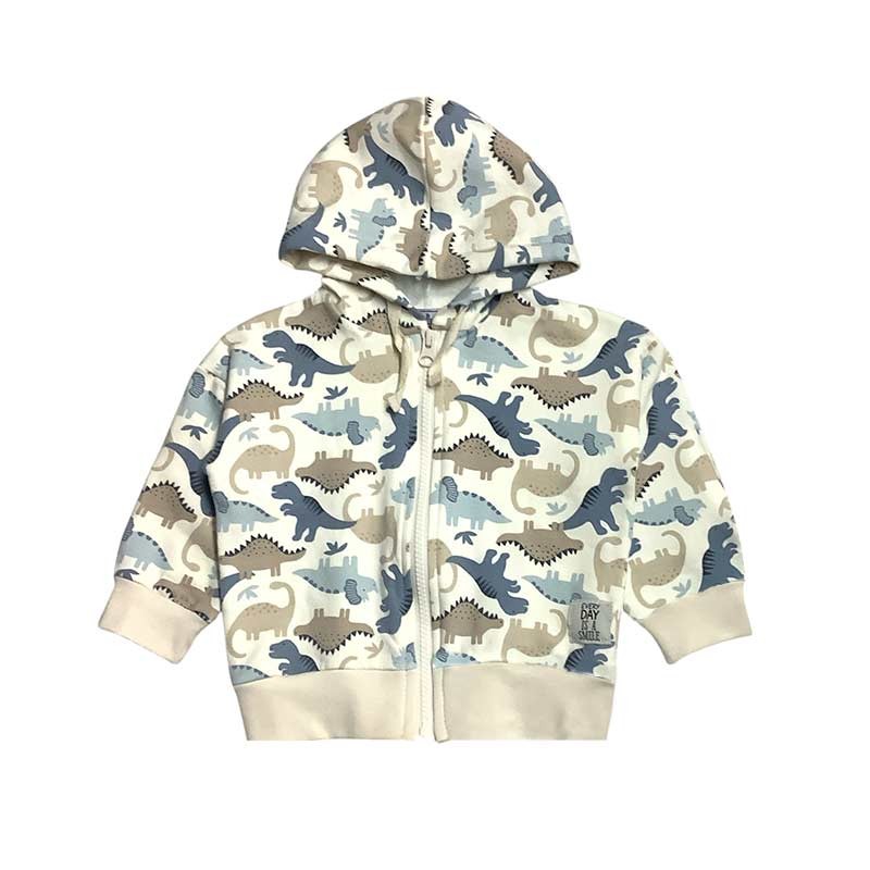 Campera bebé frisa, con puños y cordón en capucha. ESTAMPADO DINOSAURIOS