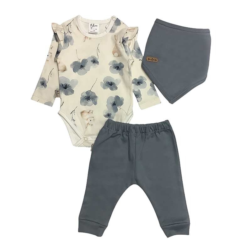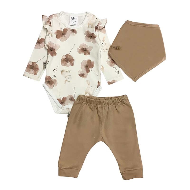 Set beba 3 piezas algodon: body algodón m/l con voladitos, pantalón c/puño y babero bandana.
