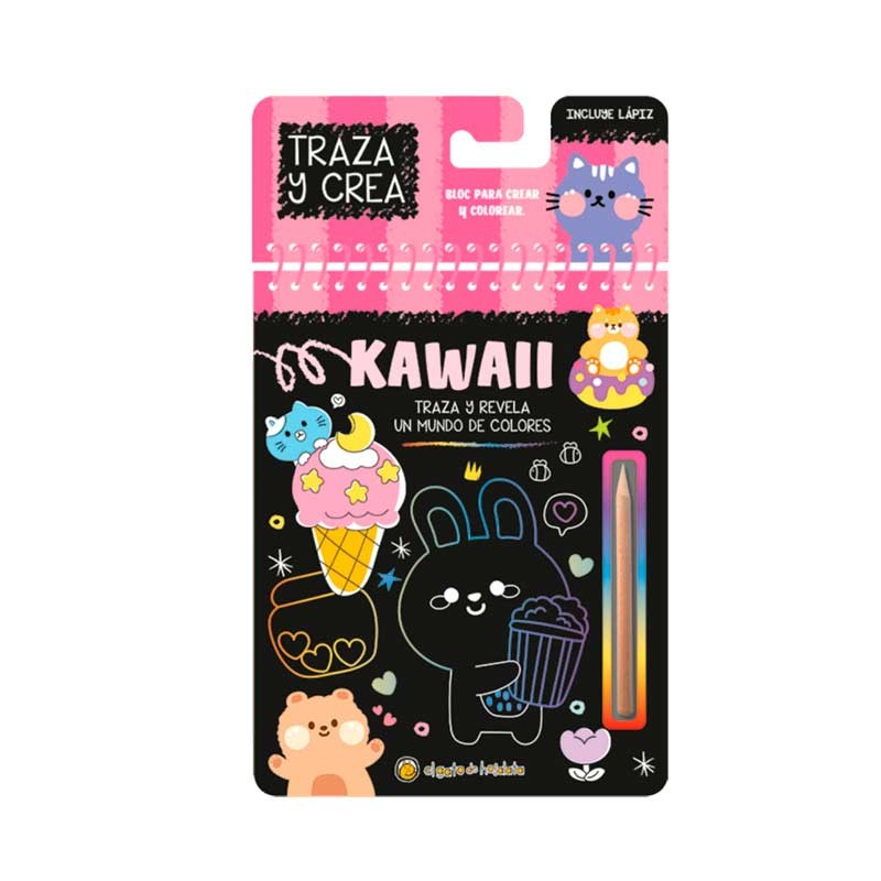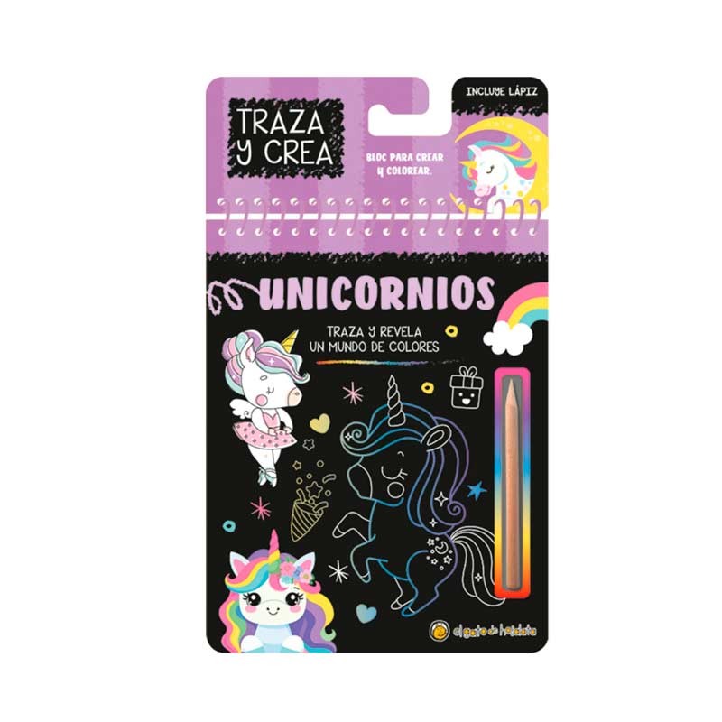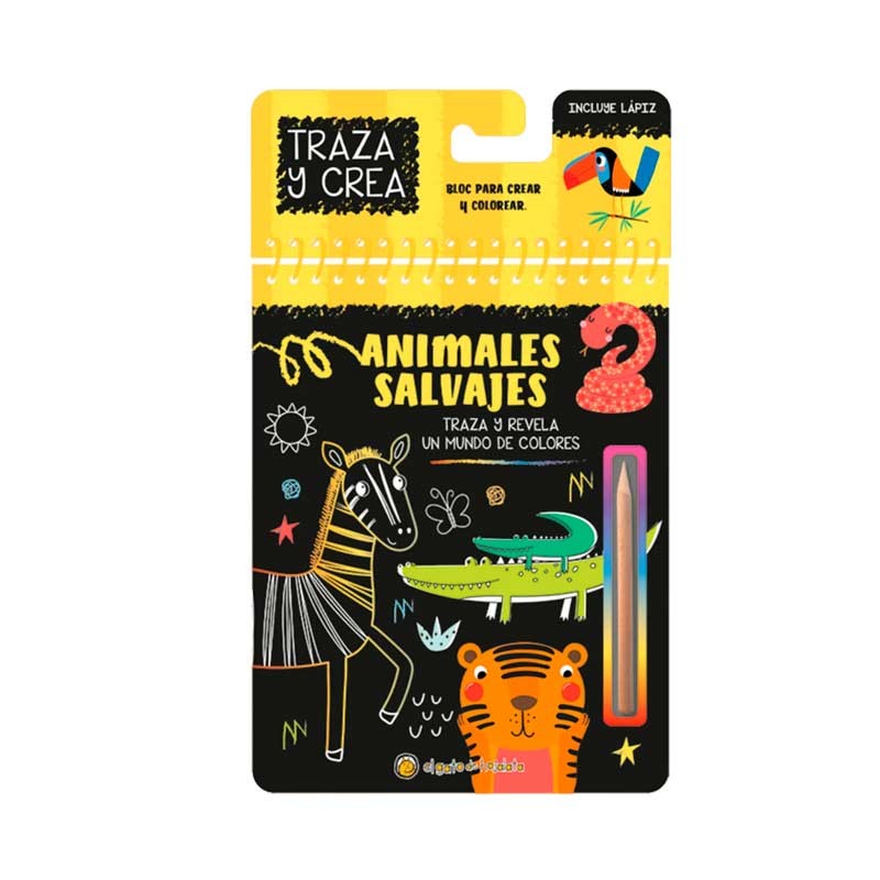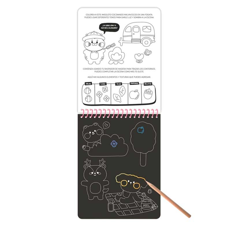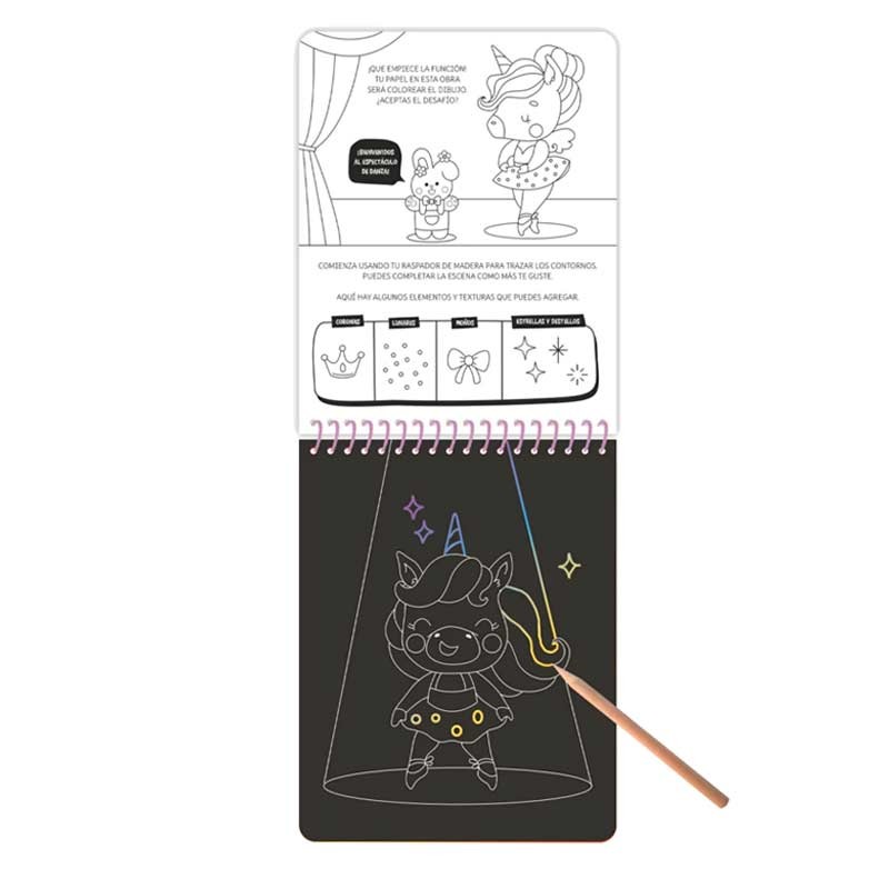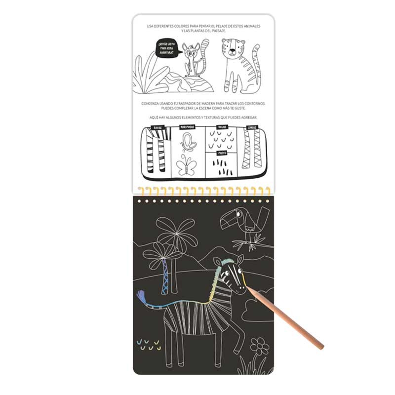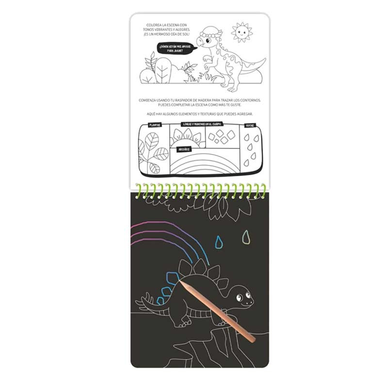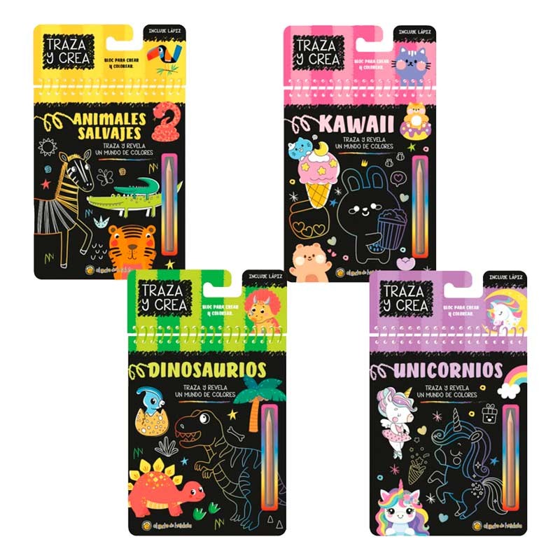 Libro para trazar y crear. Con solo usar el lápiz de madera incluido, los niños raspan las páginas negras y revelan ilustraciones llenas de color ¡como por arte de magia! Un formato llamativo, ideal para regalar y para fomentar la creatividad.